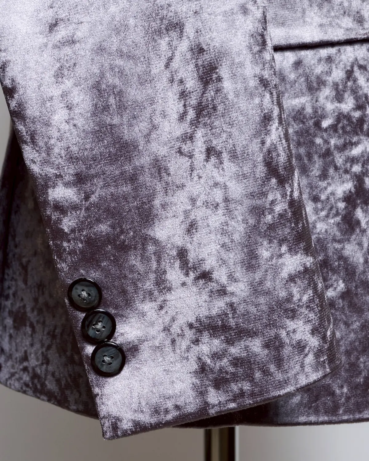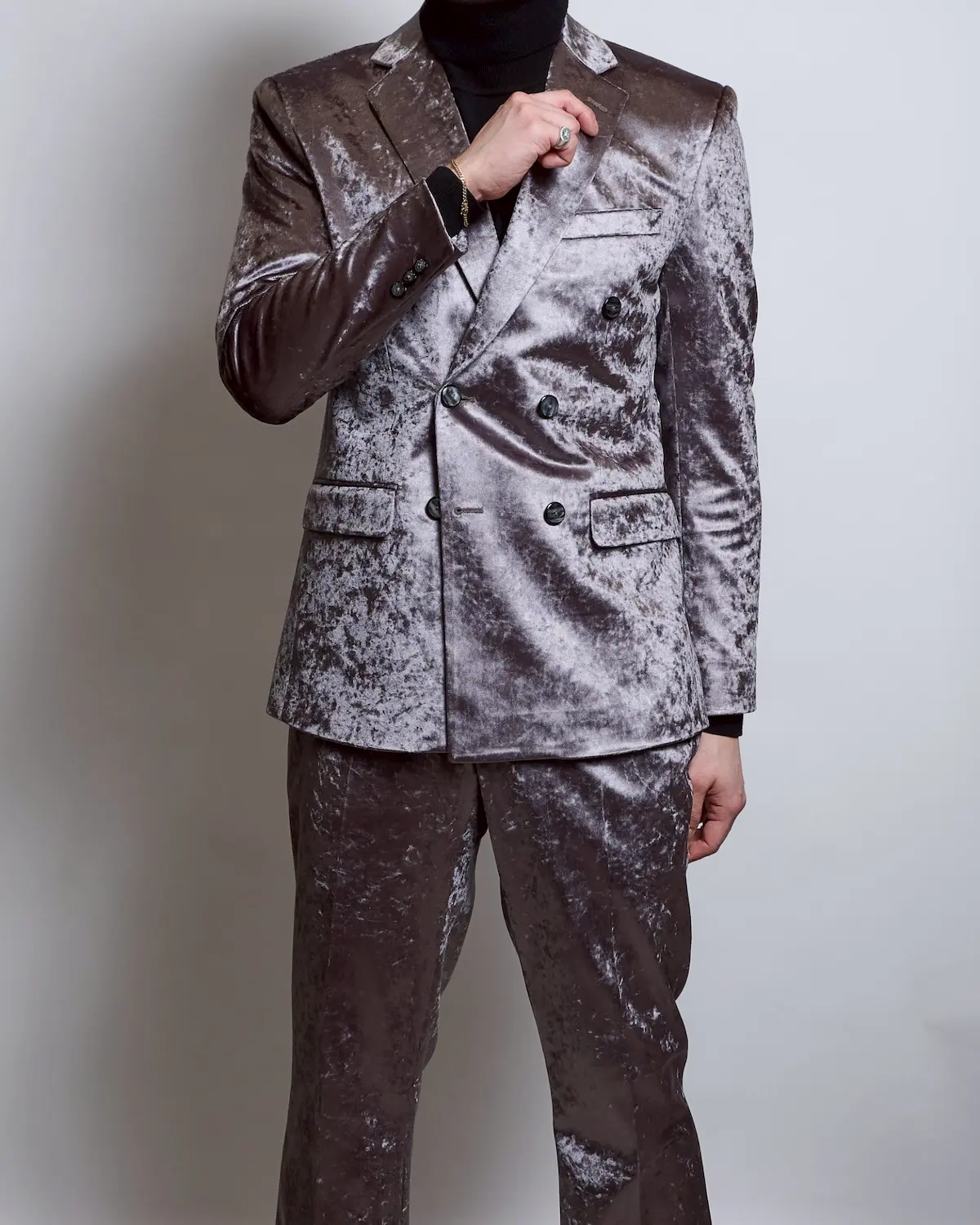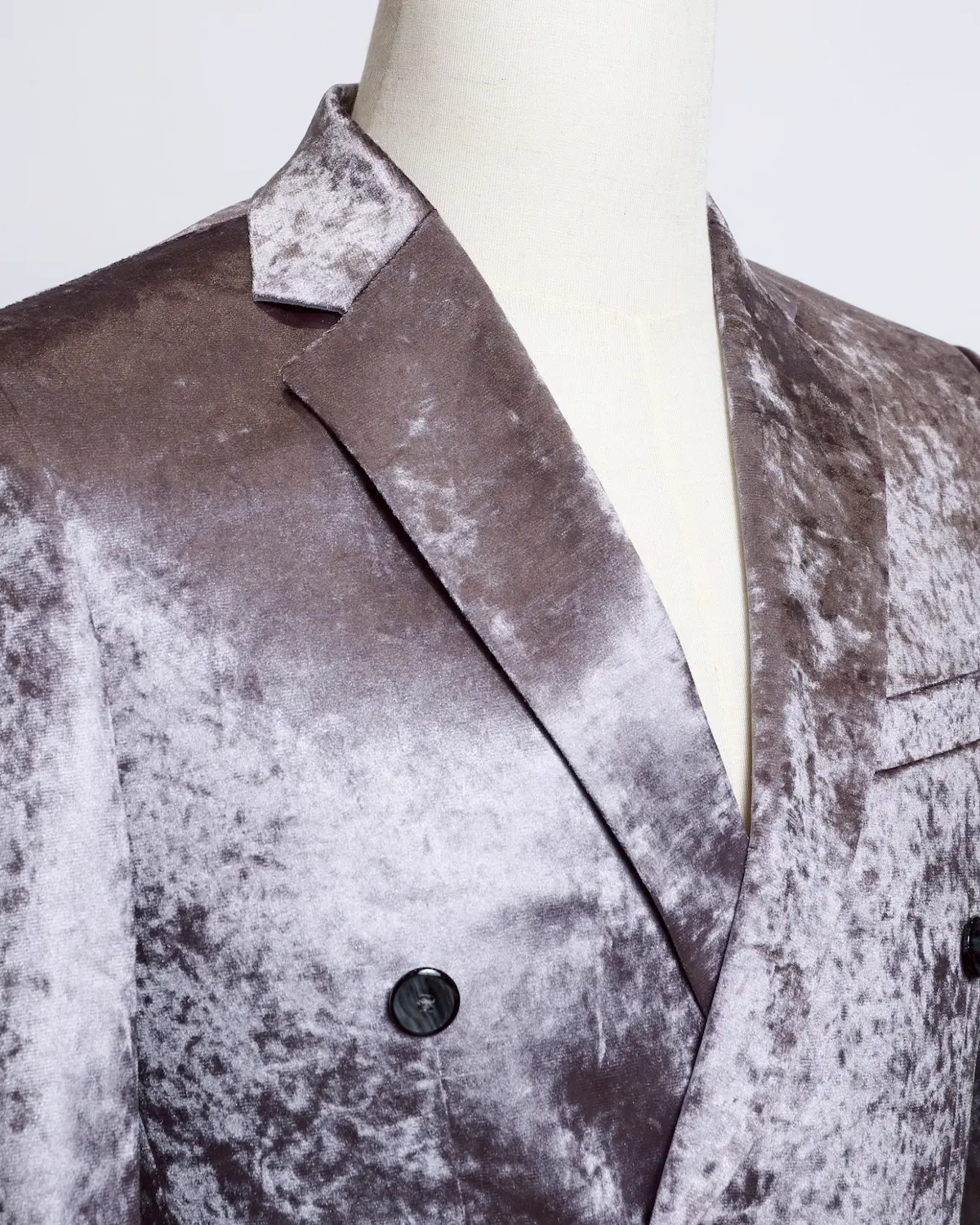 落ち着いたグレージュカラーに、クラッシュベロア特有の陰影が浮かび上がる一着。