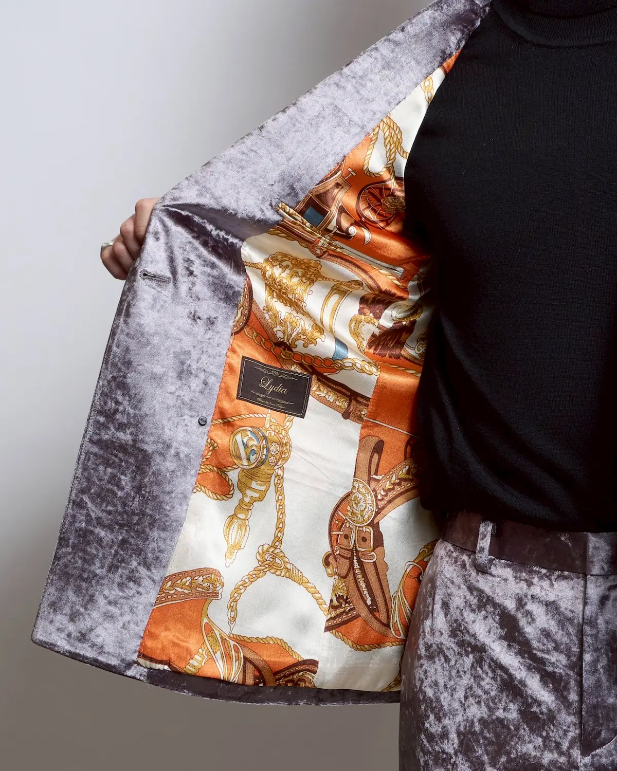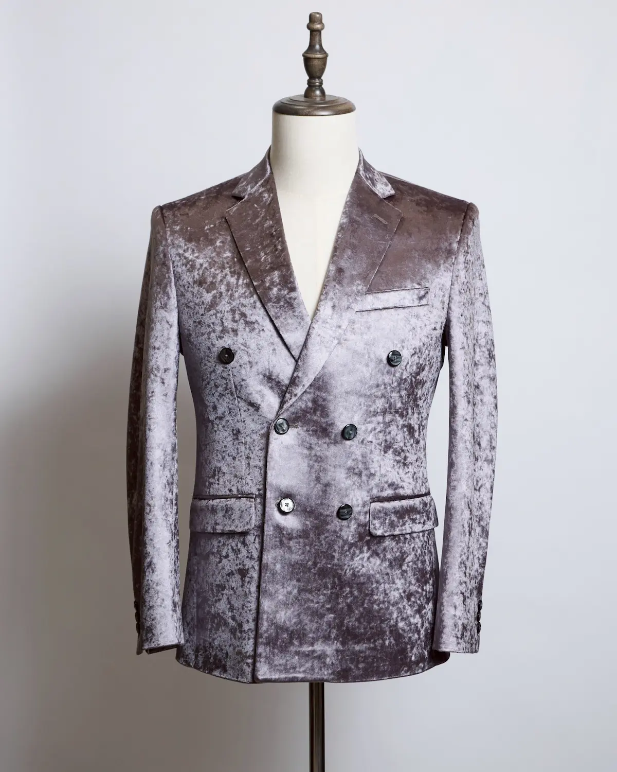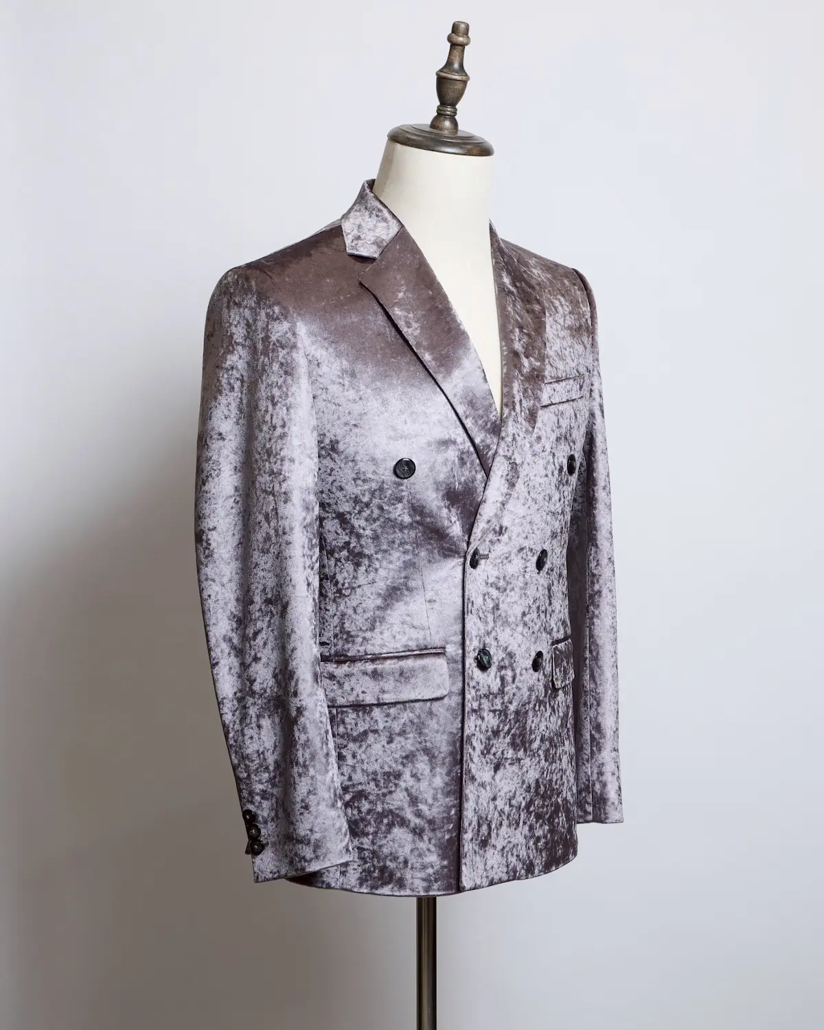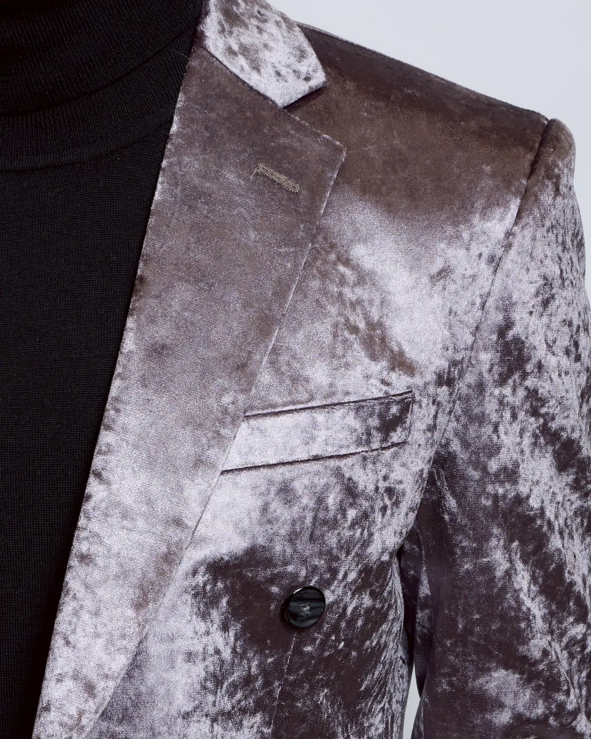 落ち着いたグレージュカラーに、クラッシュベロア特有の陰影が浮かび上がる一着。