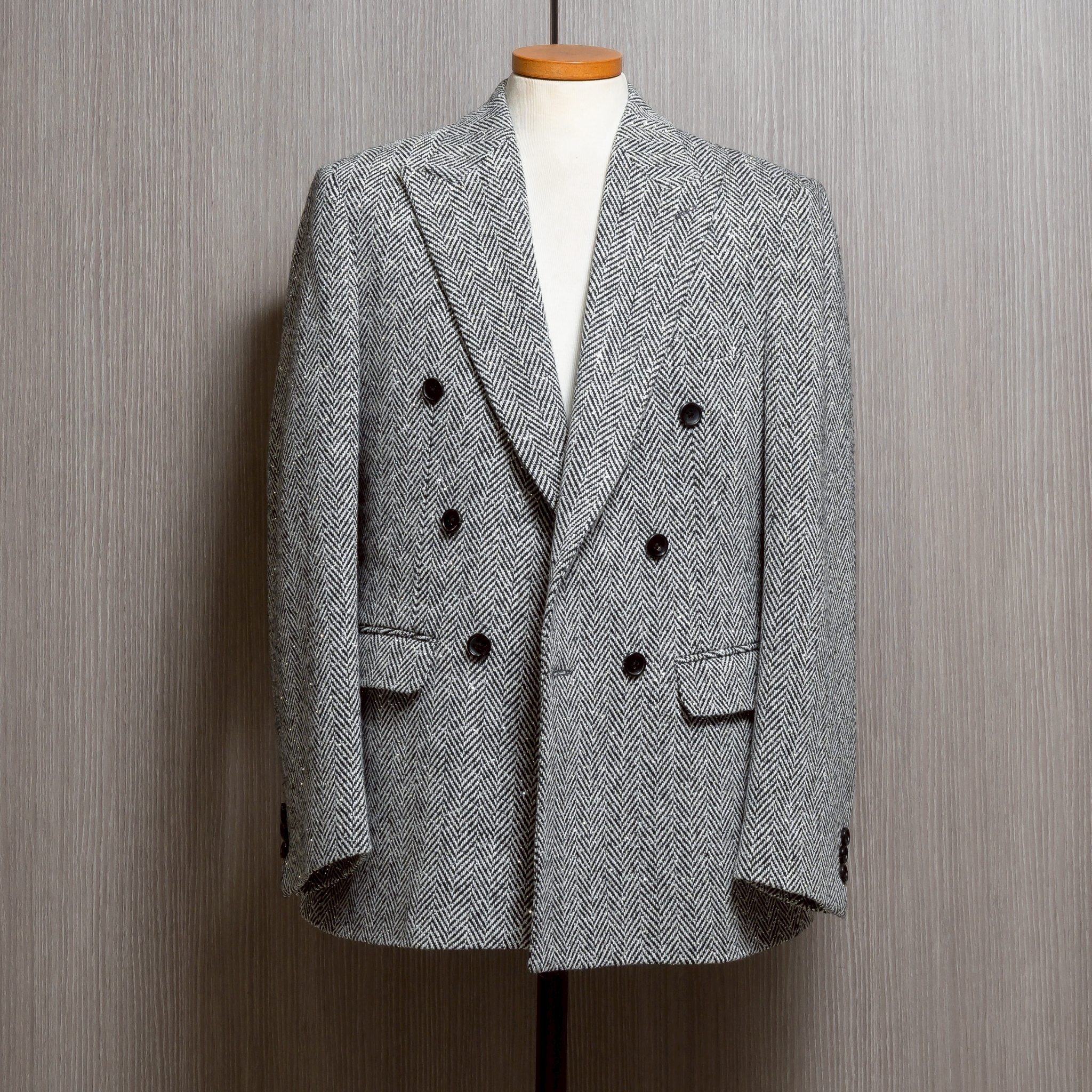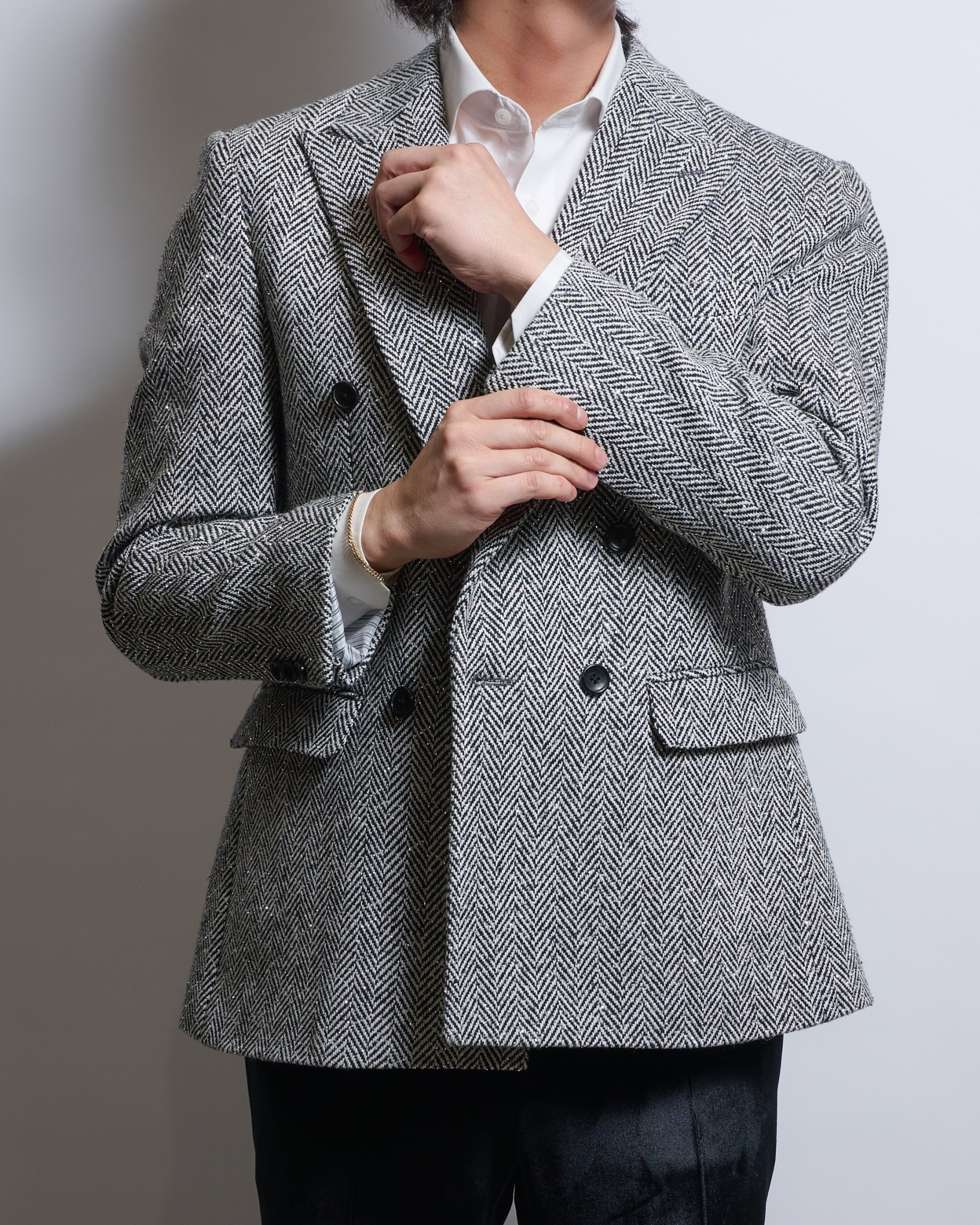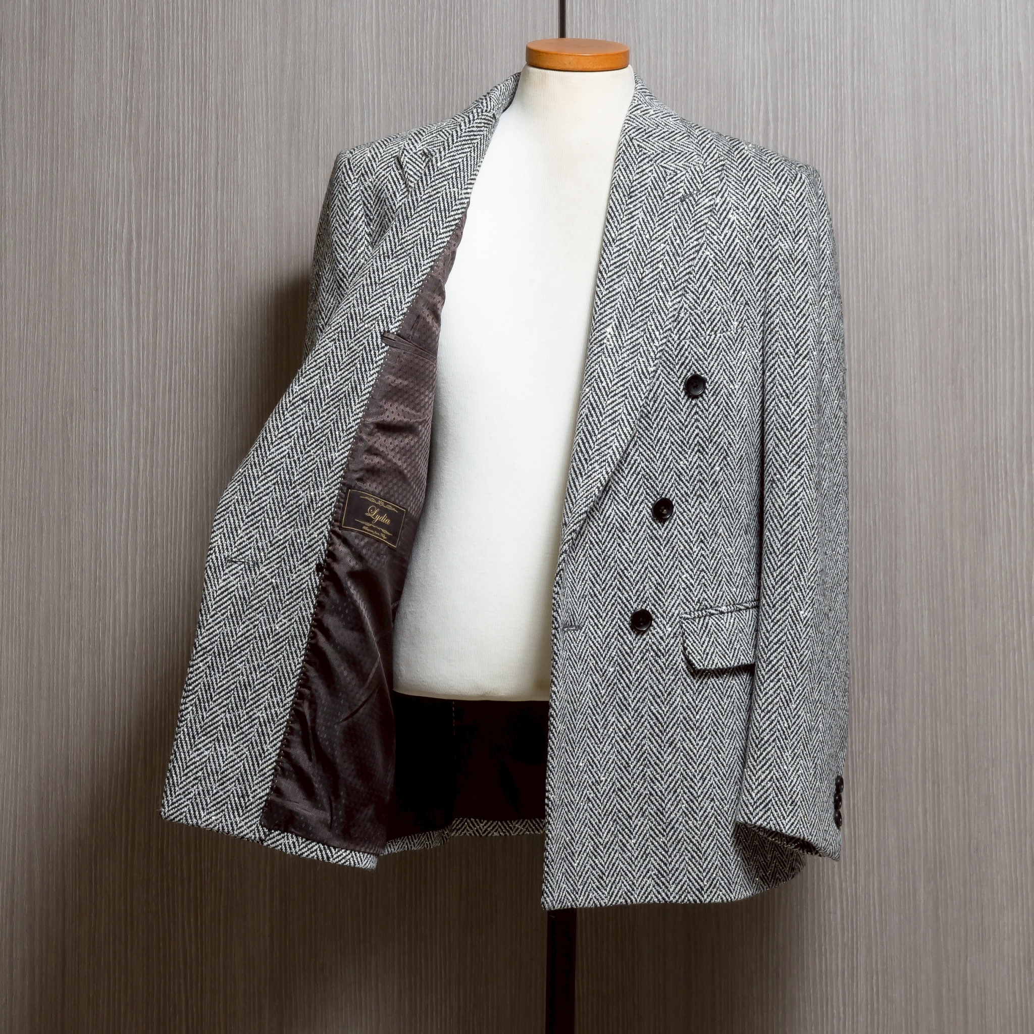 上質なウールツイードを使用したヘリンボーン柄のダブルジャケット