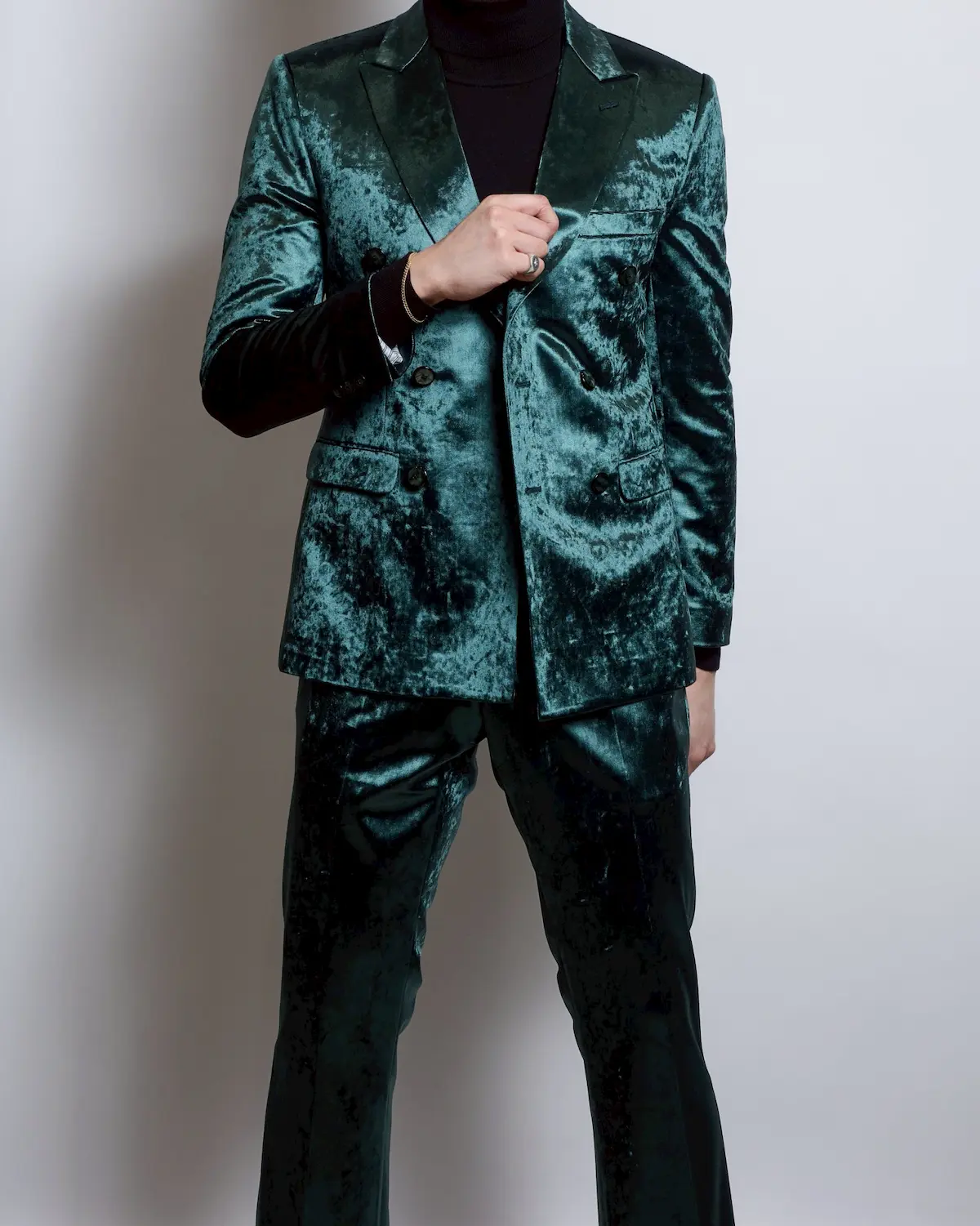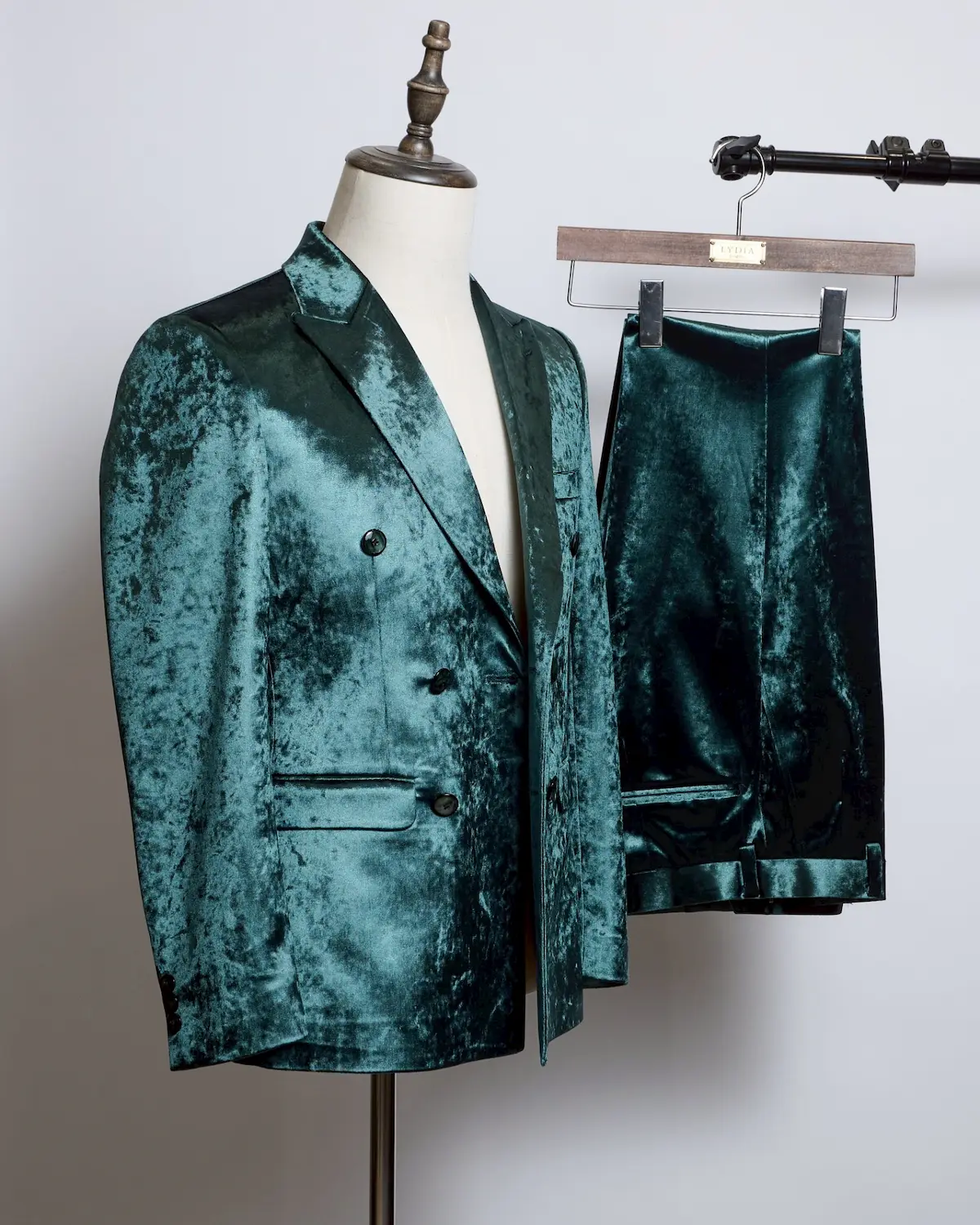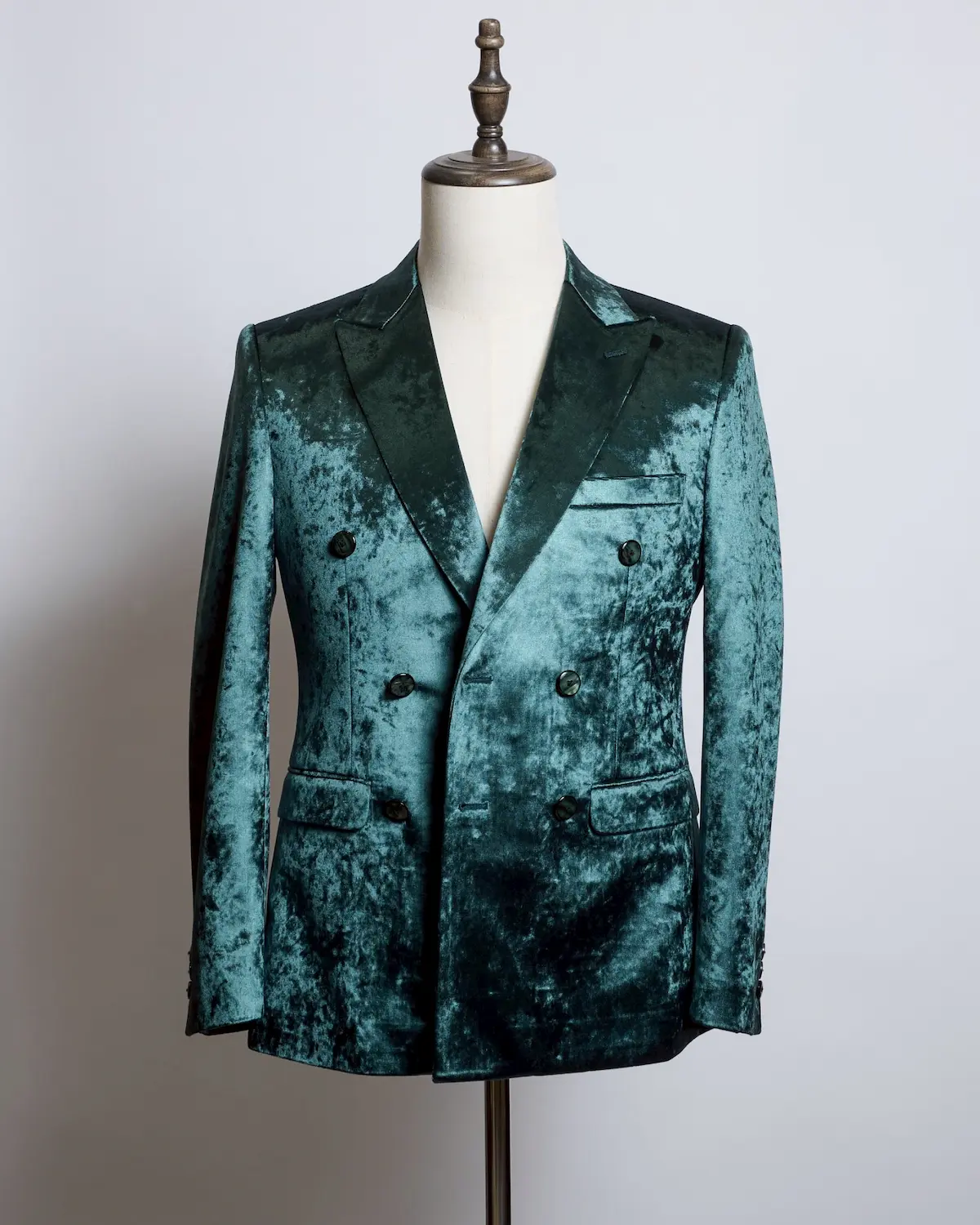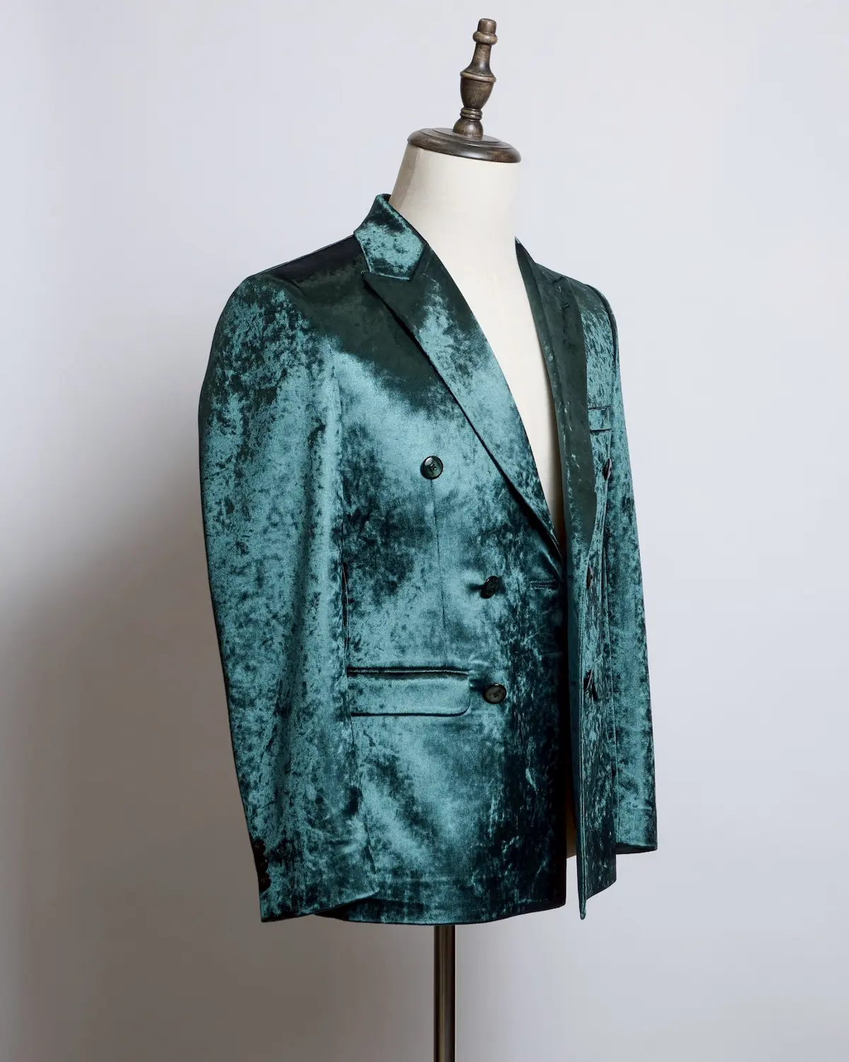 深みのあるディープグリーンのベロア生地を使用した、存在感抜群のダブルブレストセットアップ。