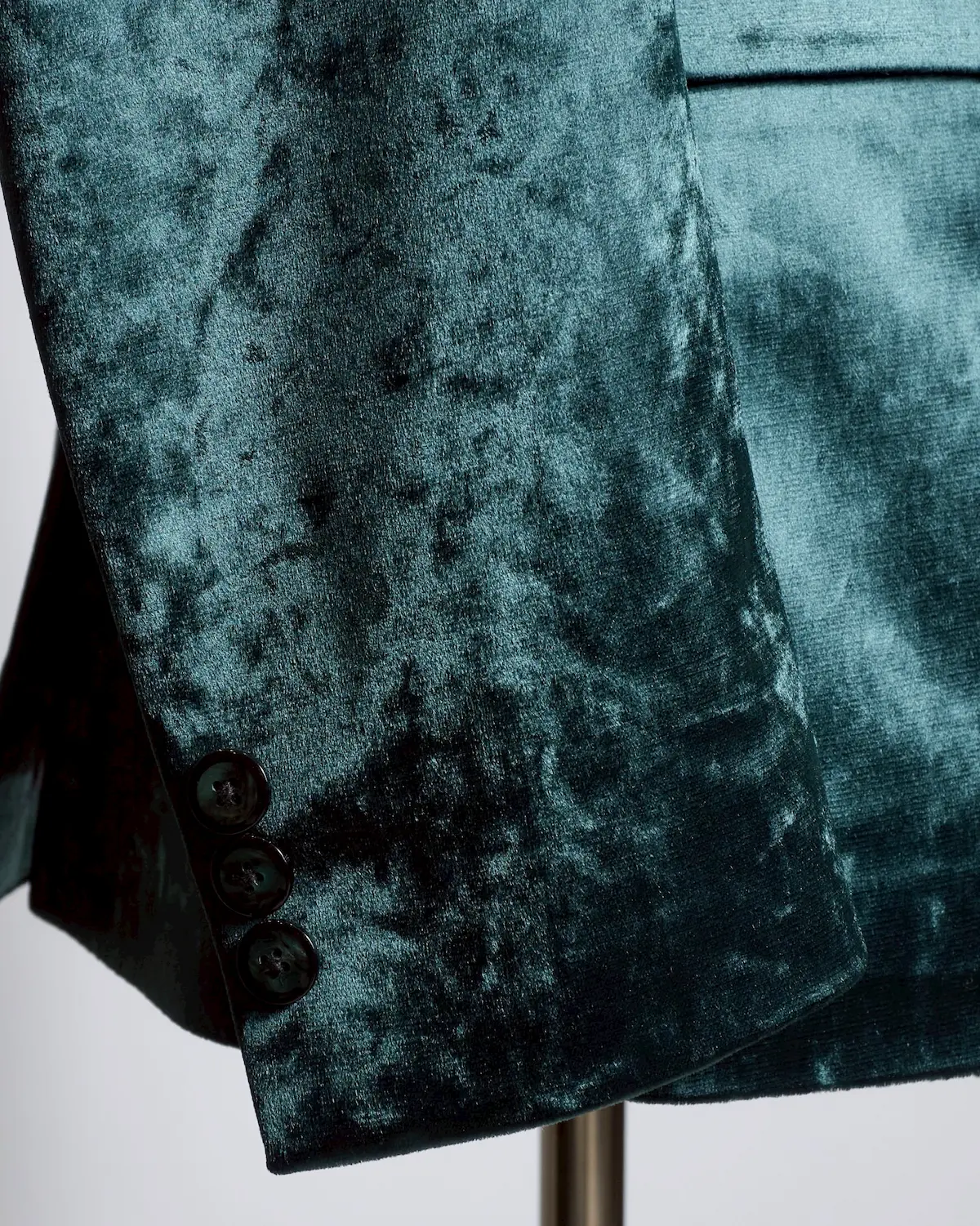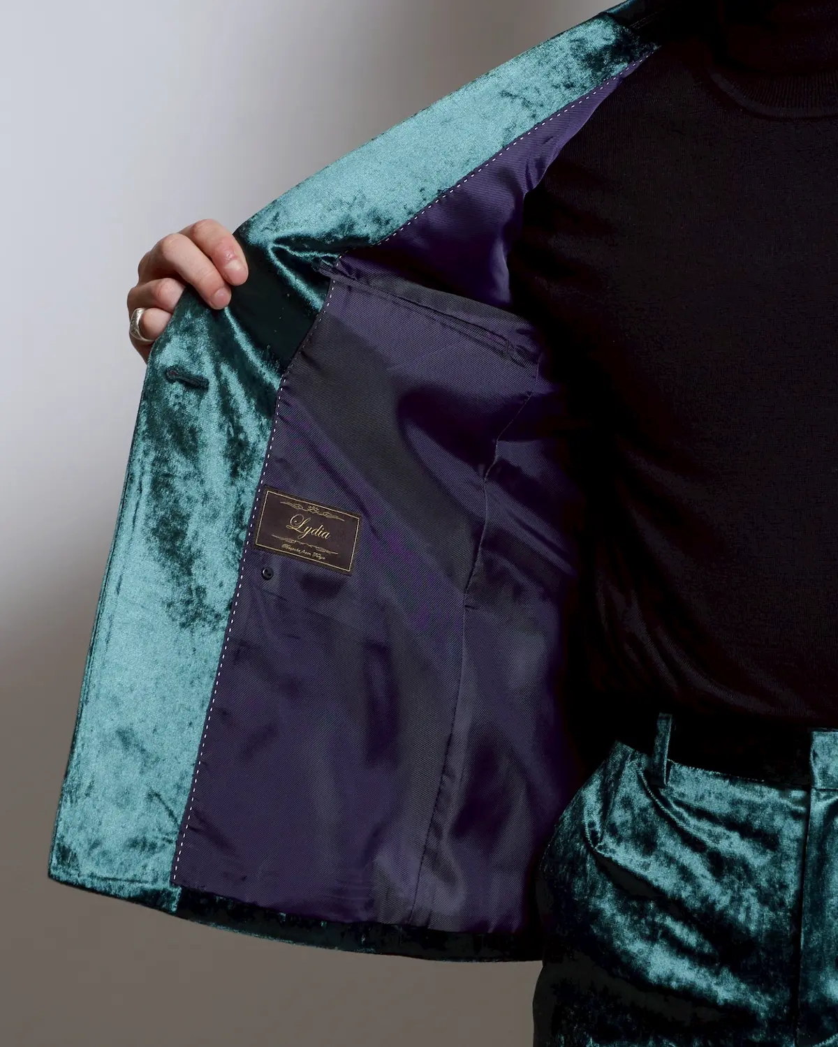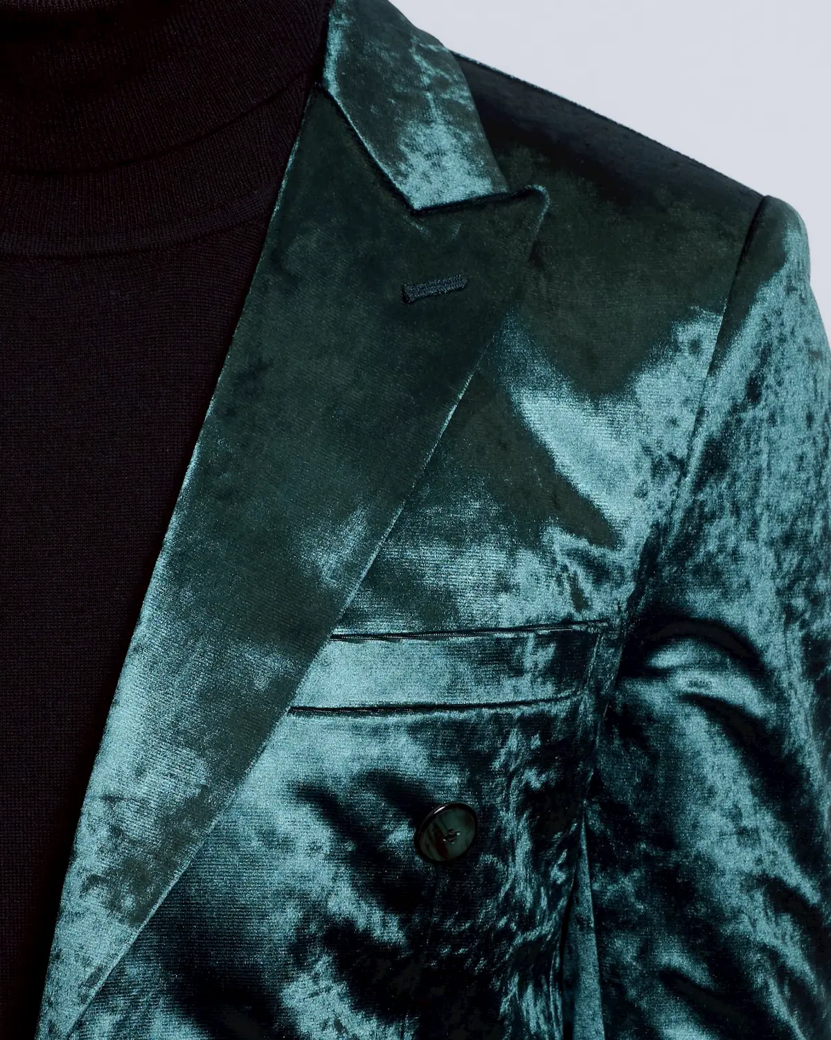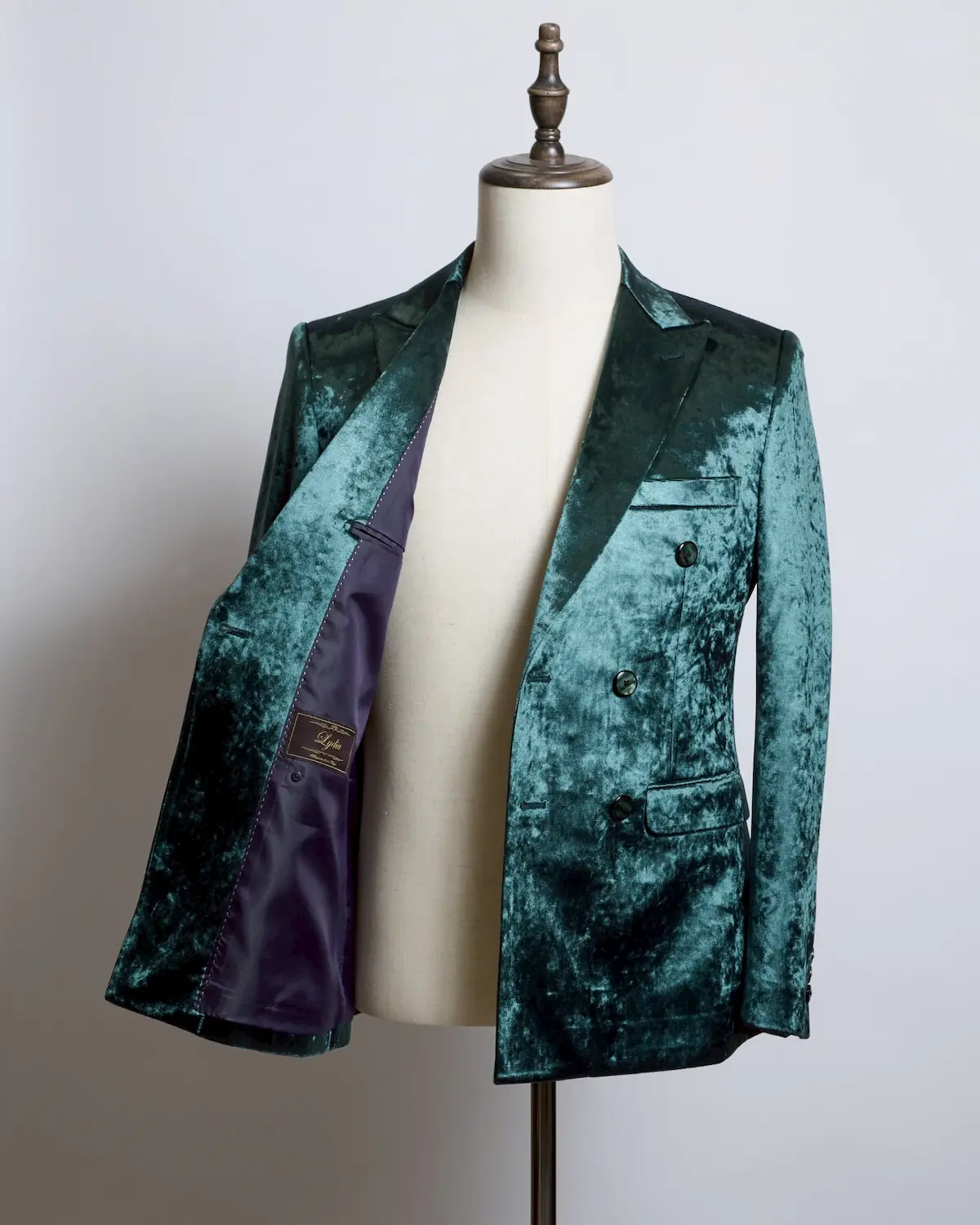 深みのあるディープグリーンのベロア生地を使用した、存在感抜群のダブルブレストセットアップ。
