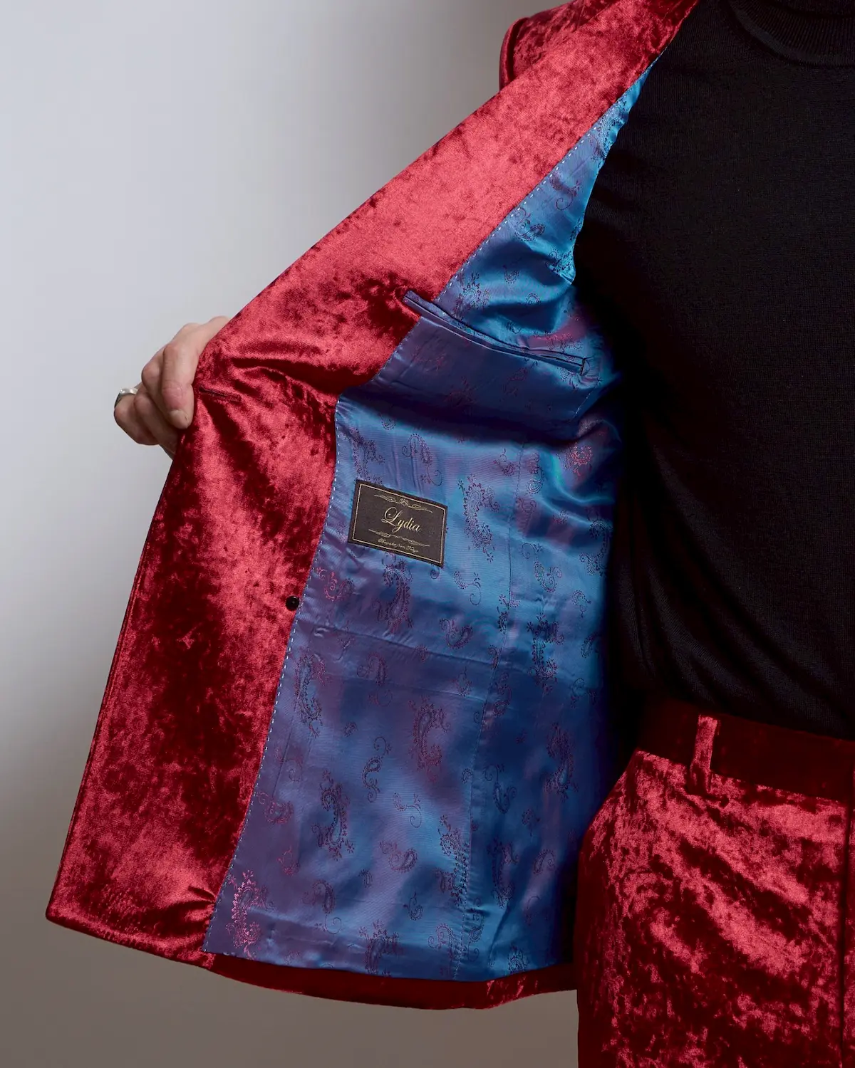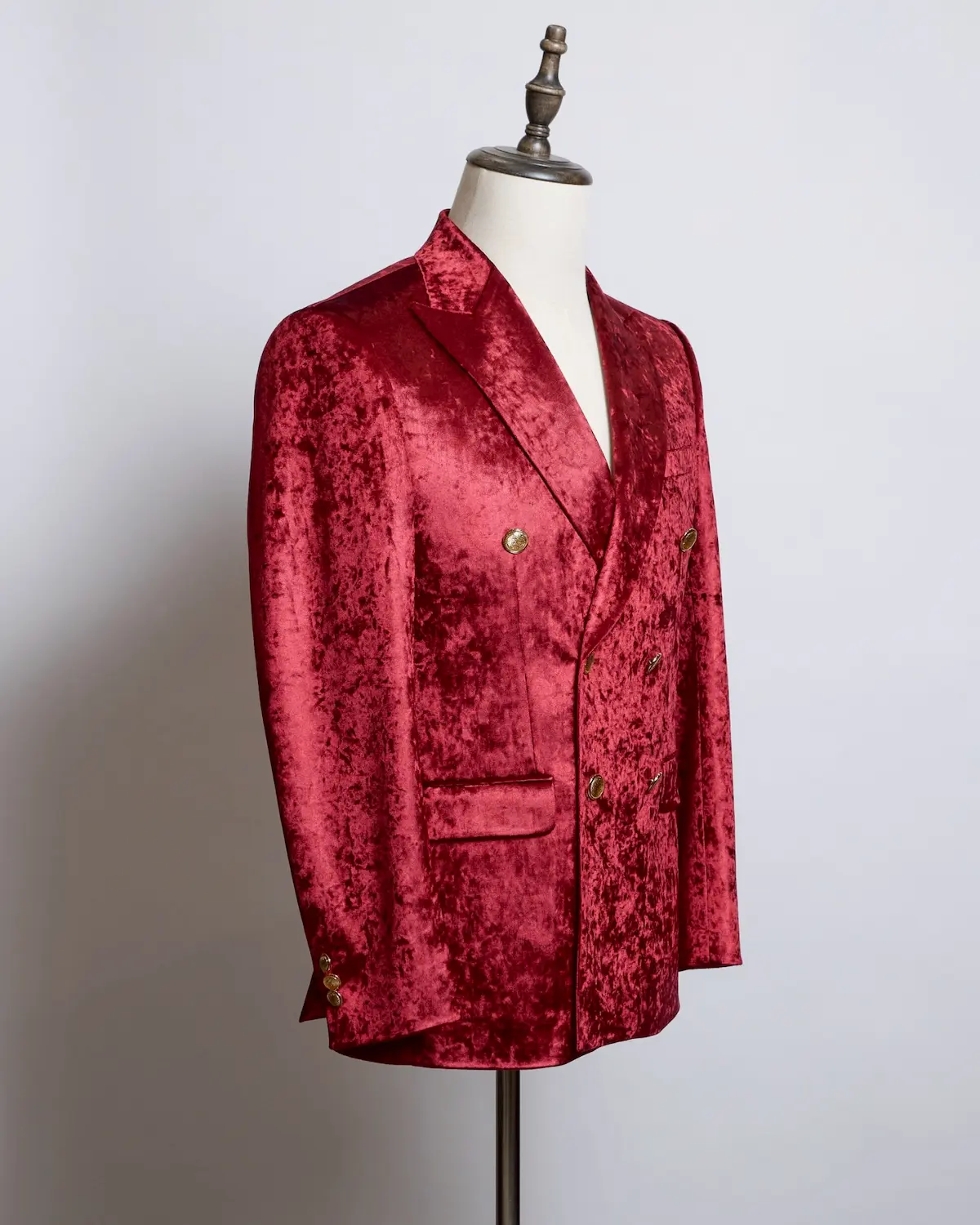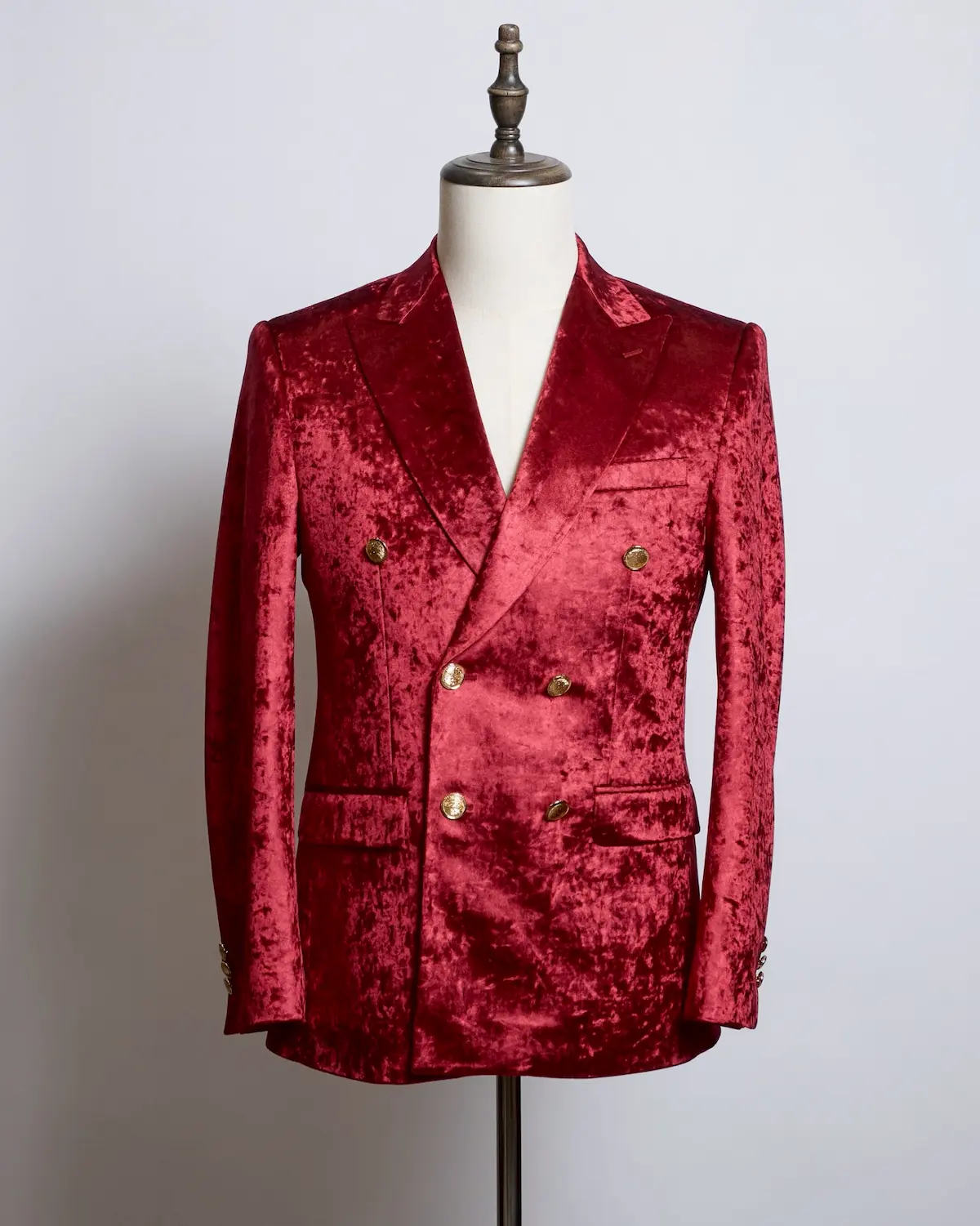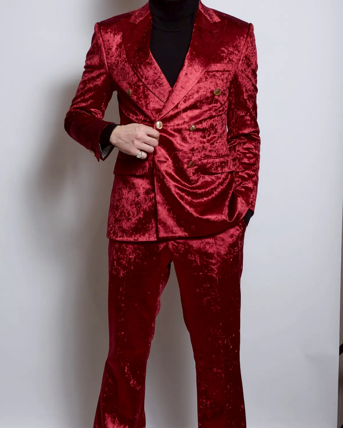 深みのあるレッドベロアを贅沢に使用した、存在感抜群のセットアップ。