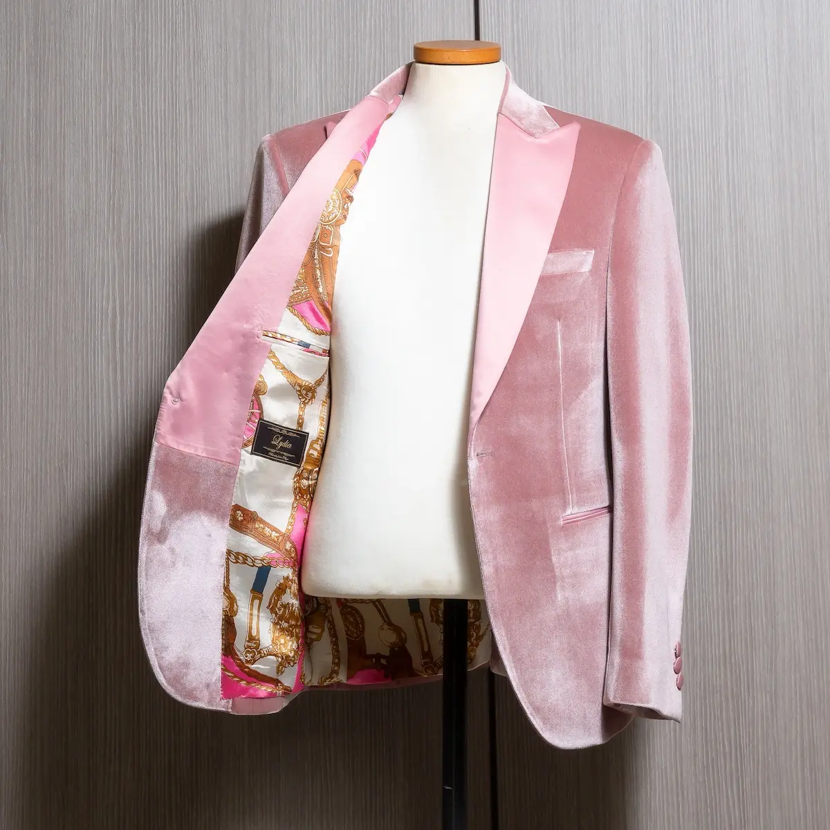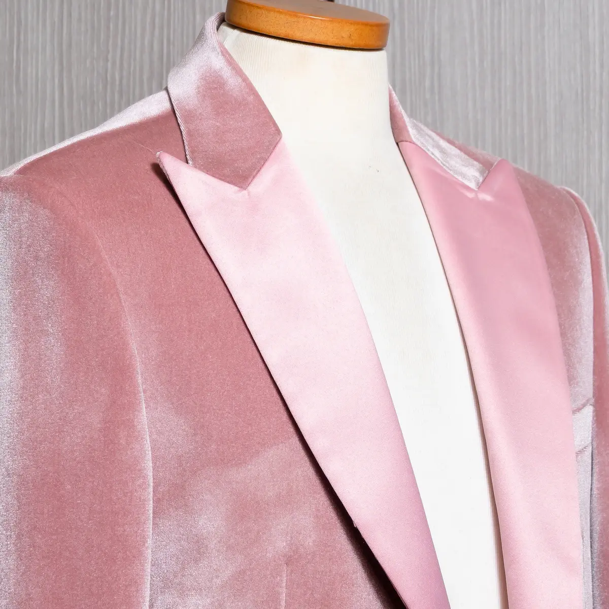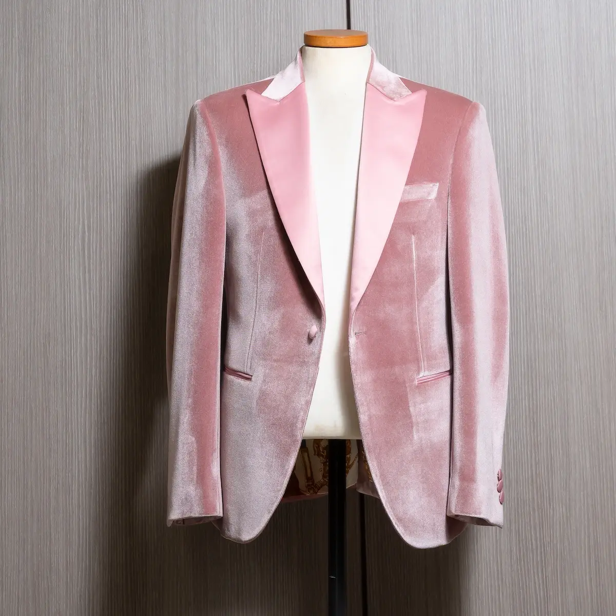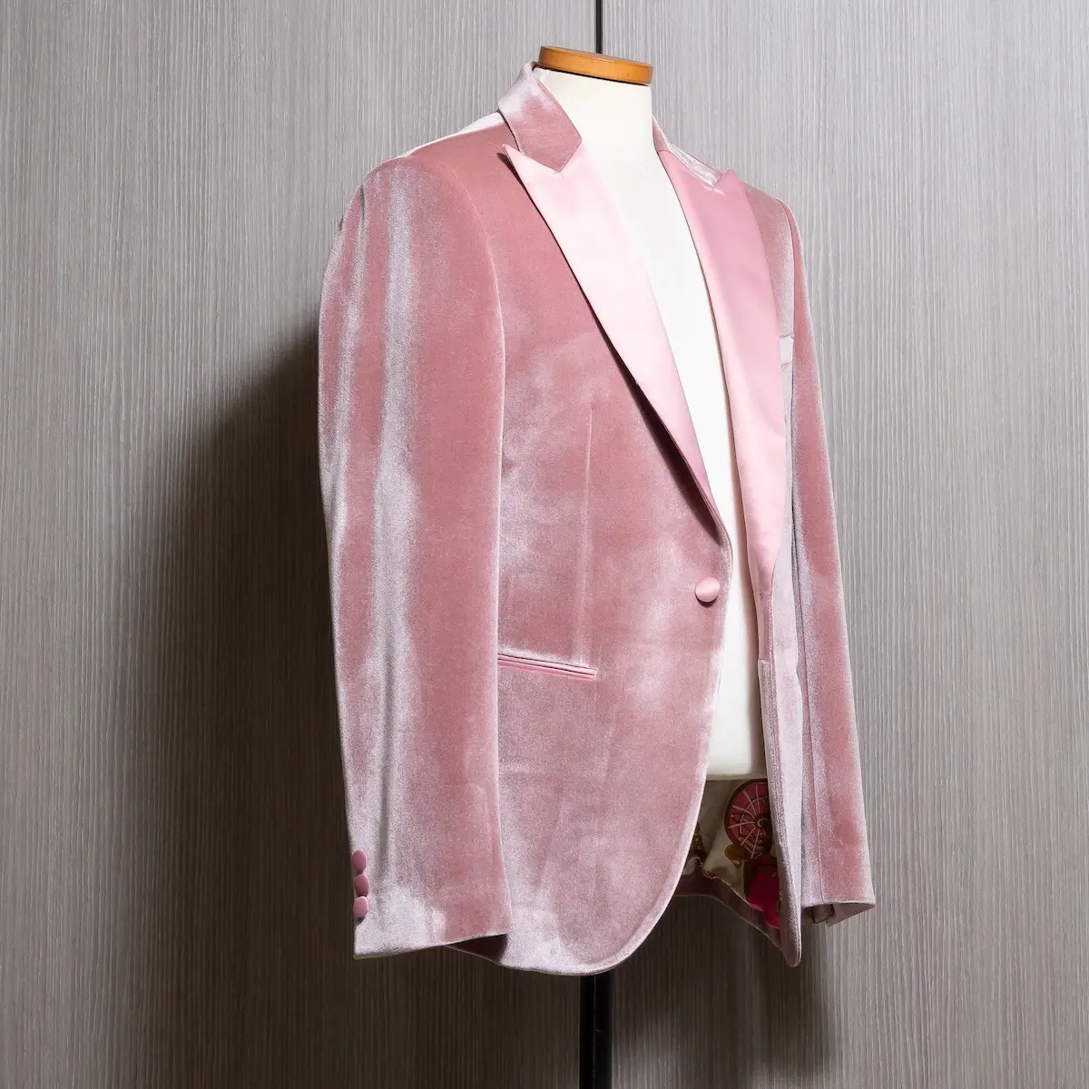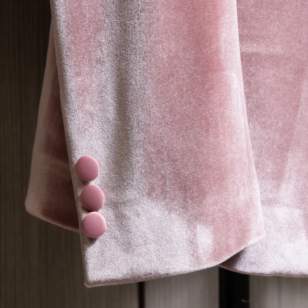 淡いピンクのベロアが放つ優しい光沢感は、洗練された華やかさを纏いながらも軽やかな雰囲気を演出します。