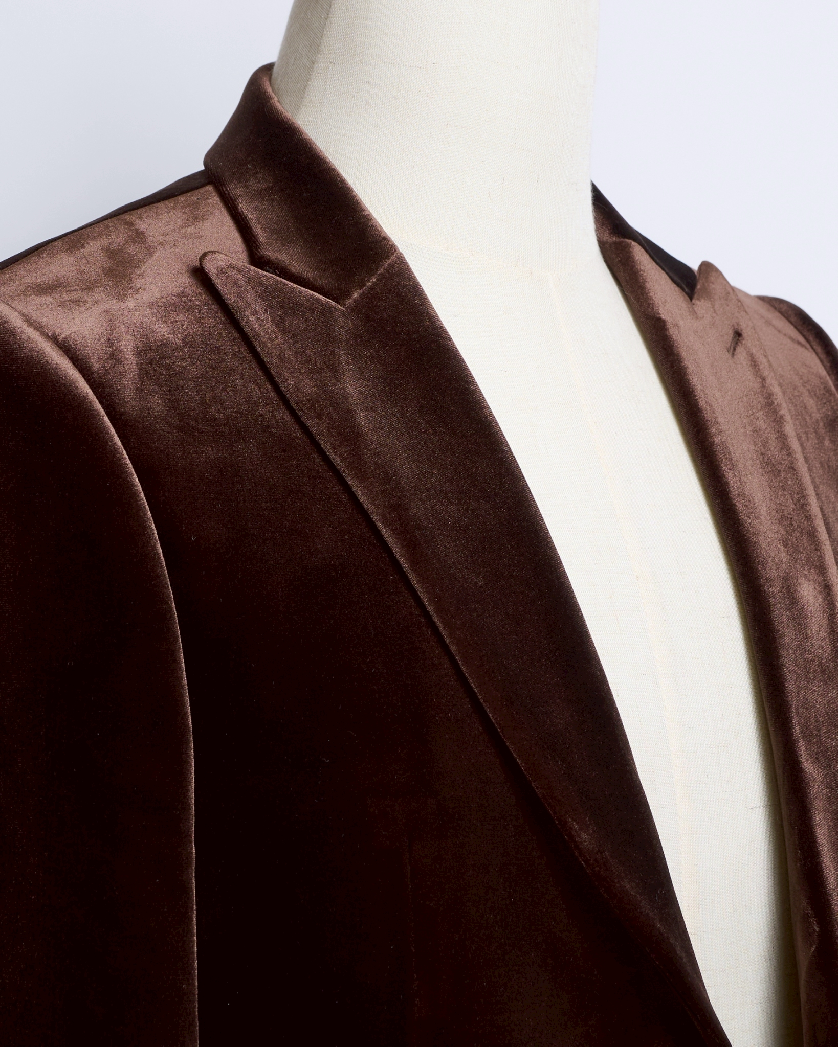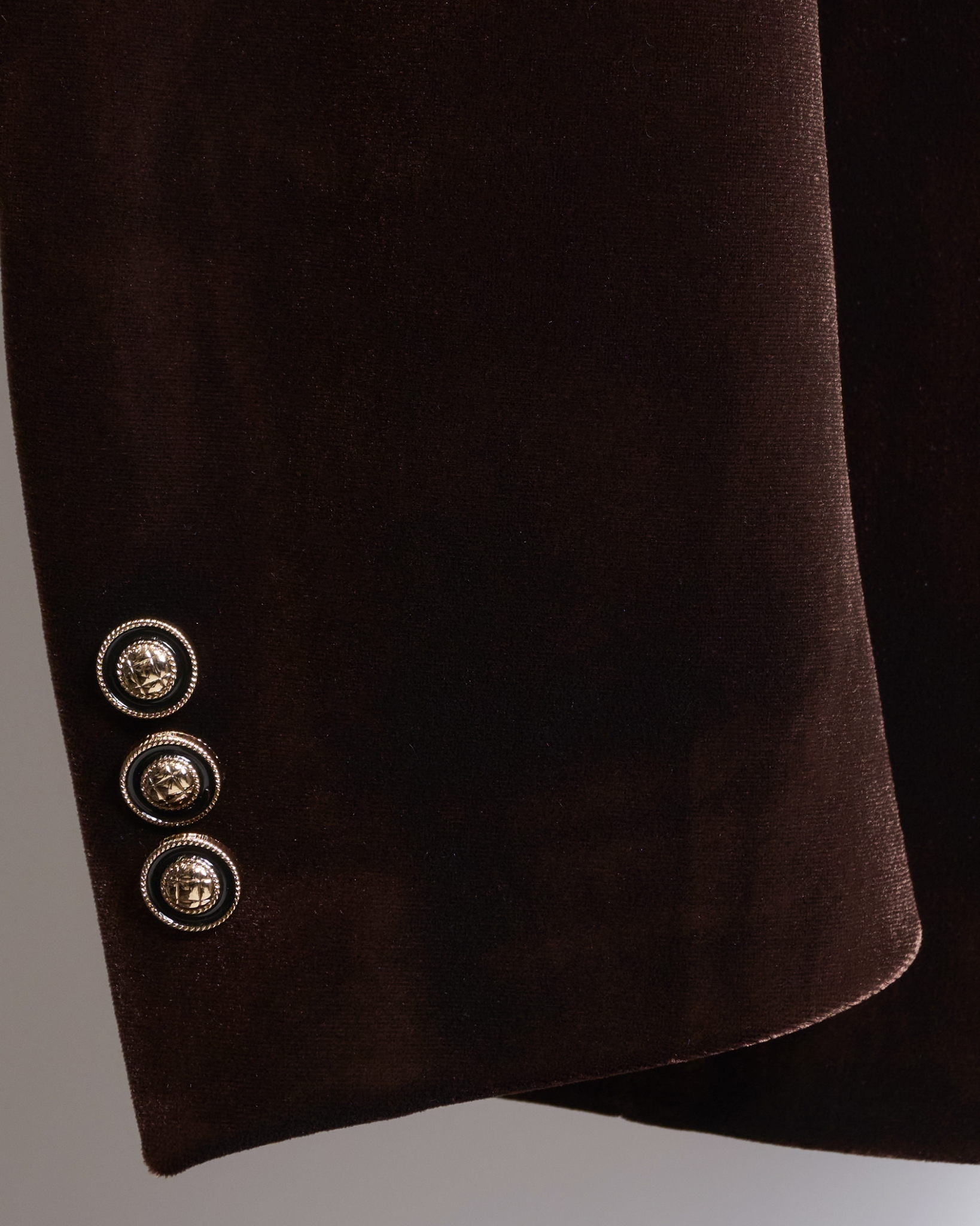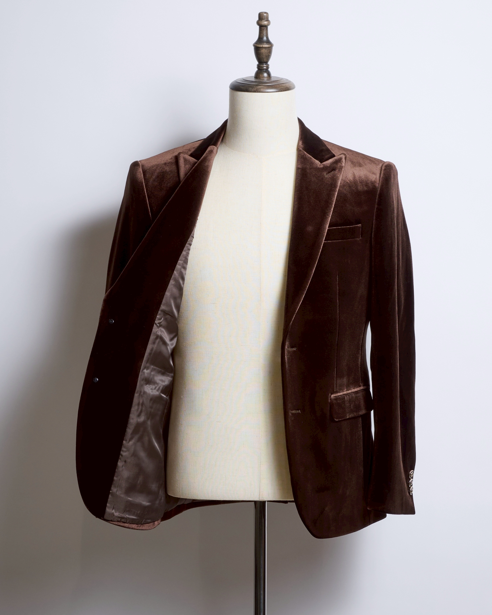滑らかな光沢をたたえたブラウンベロアは、角度によって陰影が変化し、まるでチョコレートのような深い艶を演出。