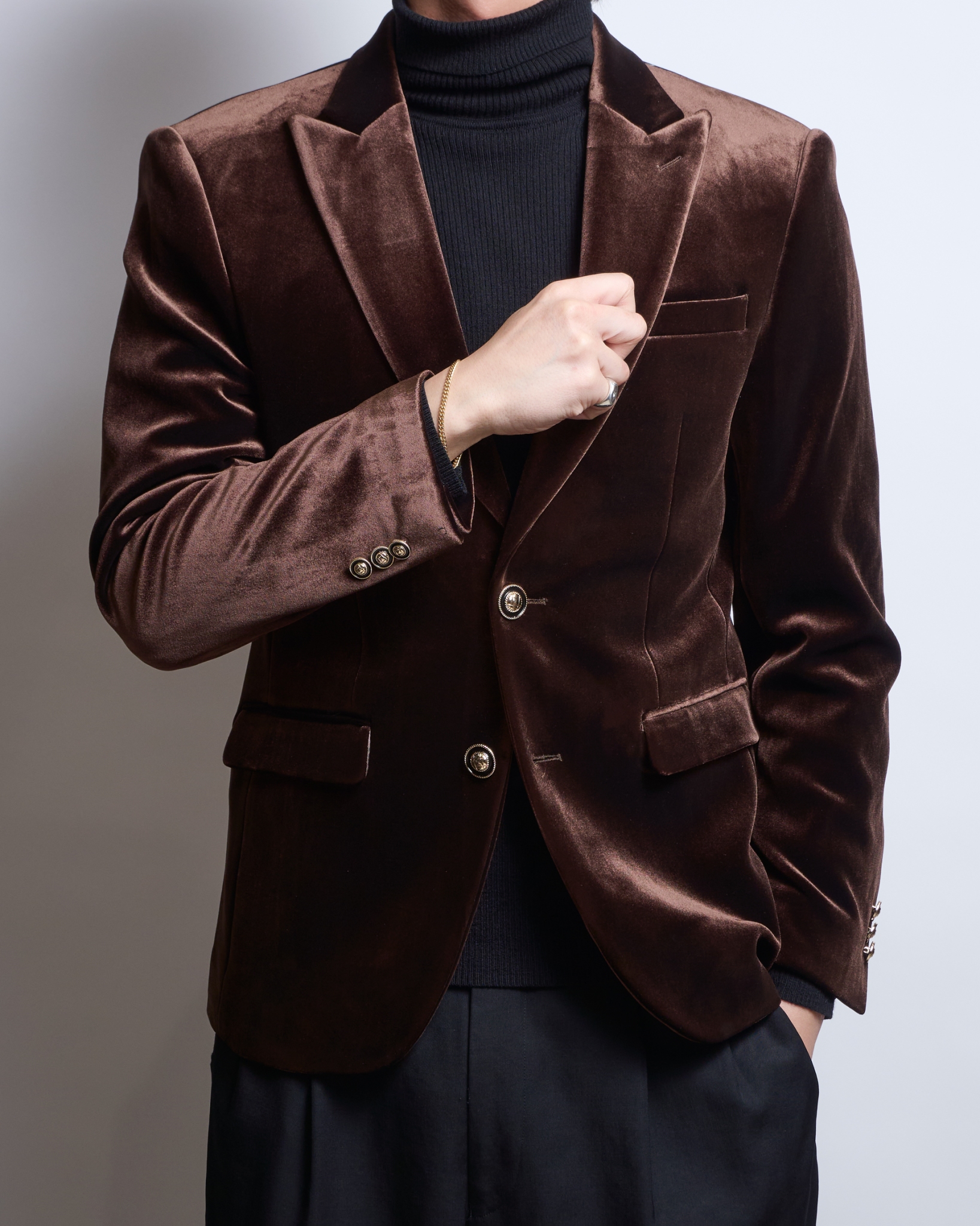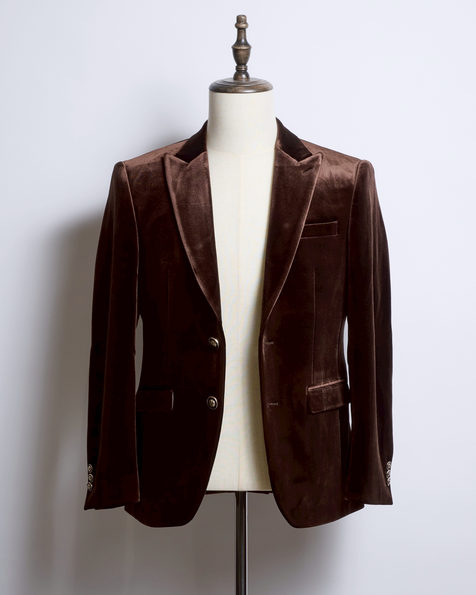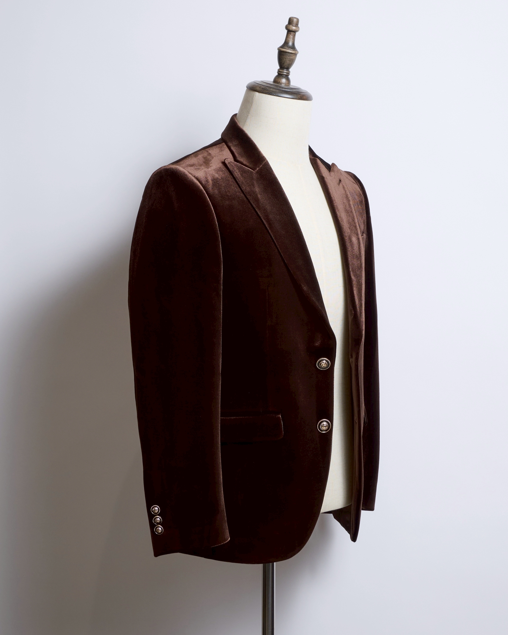 滑らかな光沢をたたえたブラウンベロアは、角度によって陰影が変化し、まるでチョコレートのような深い艶を演出。
