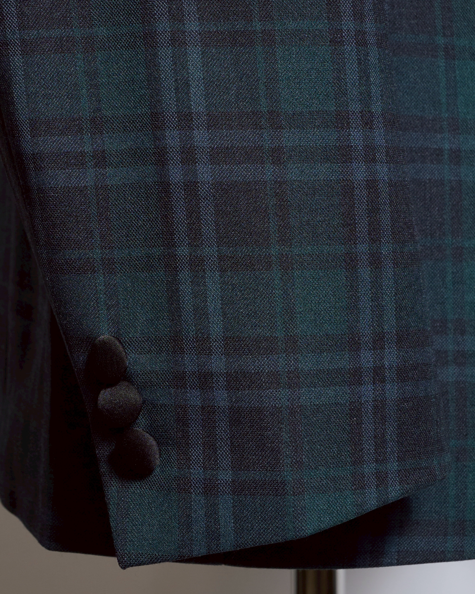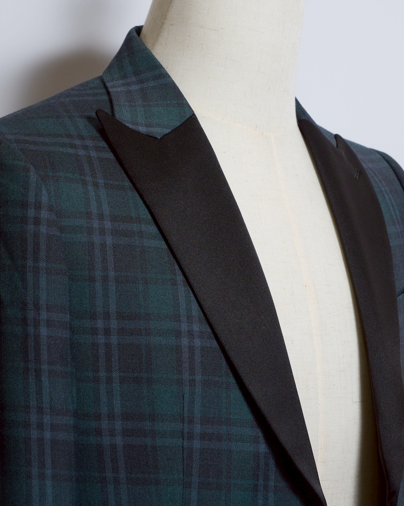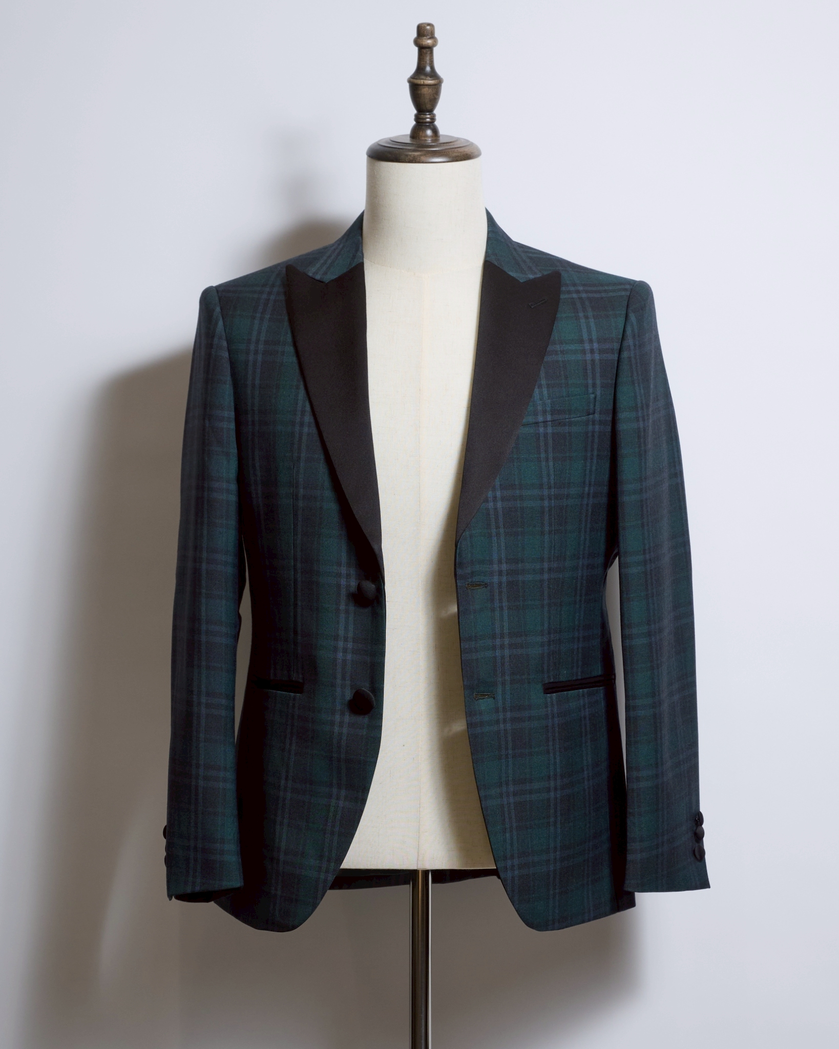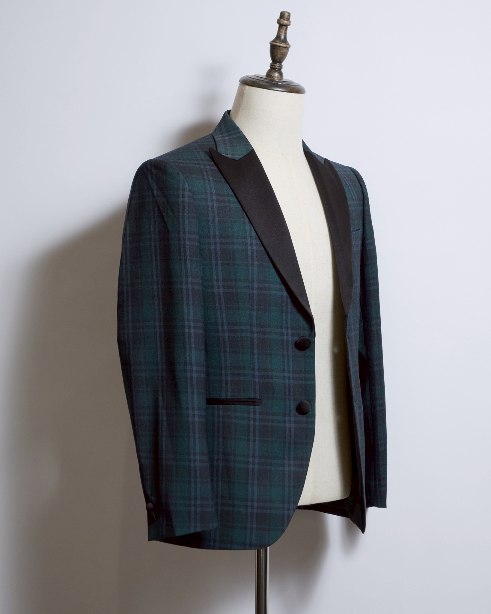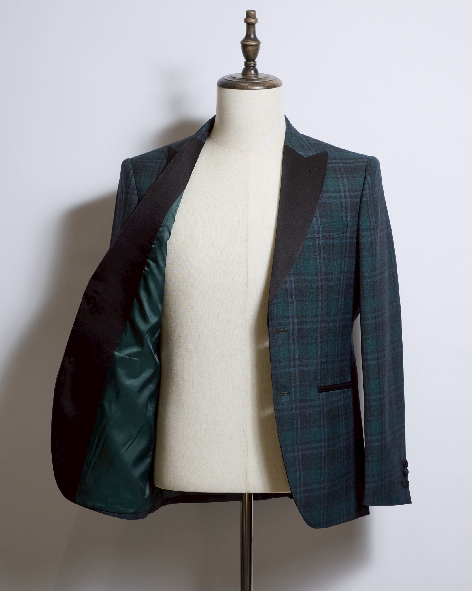 深みのあるグリーンとネイビーが織りなすブラックウォッチチェックを使用した、クラシックかつモダンなジャケット。落ち着いたトーンのチェックに、艶やかなブラックサテンを組み合わせることで、上品なコントラストを生み出しています。