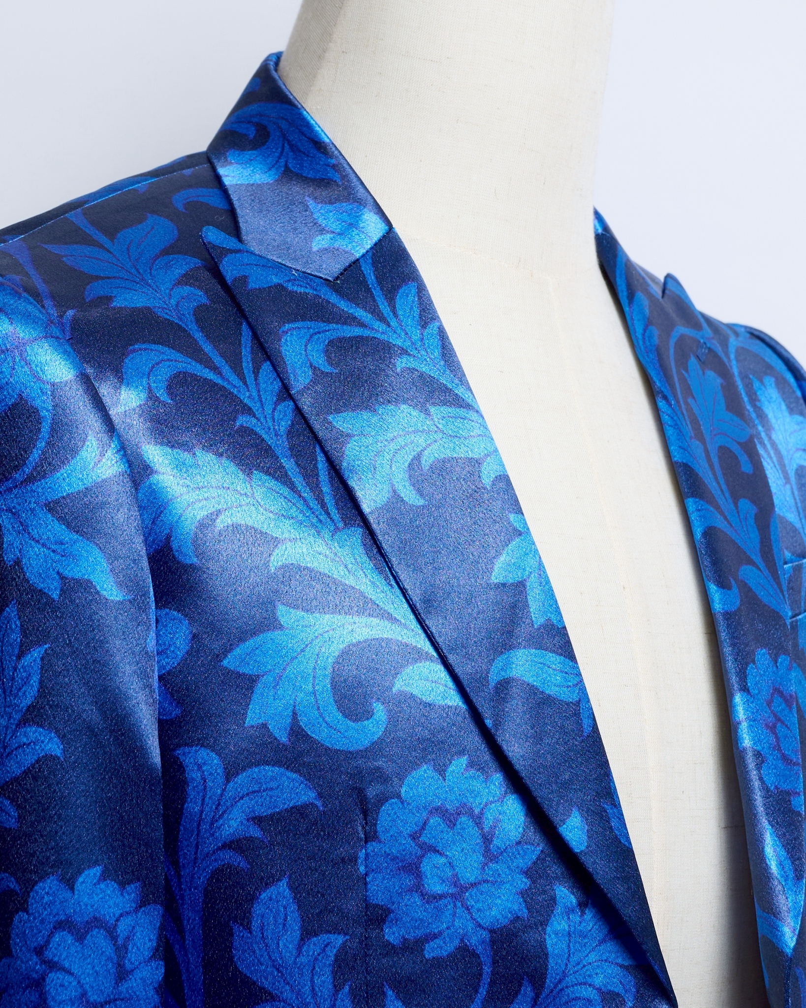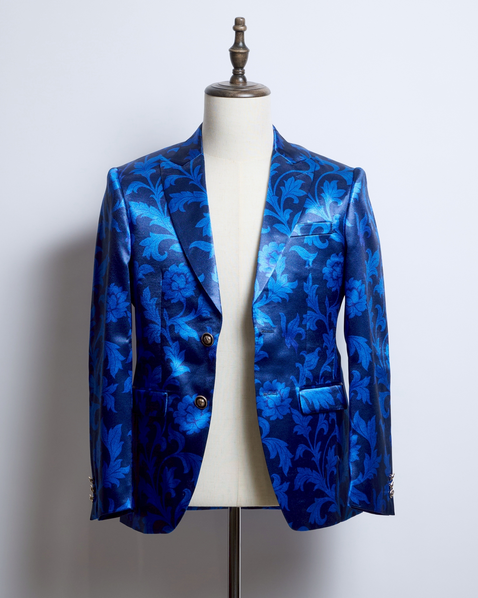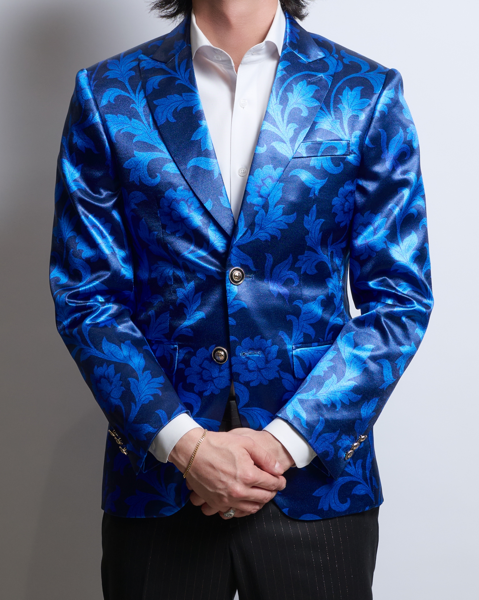 深みのあるネイビーベースに、鮮やかなブルーの花柄を織り込んだジャガード生地のシングルジャケット。