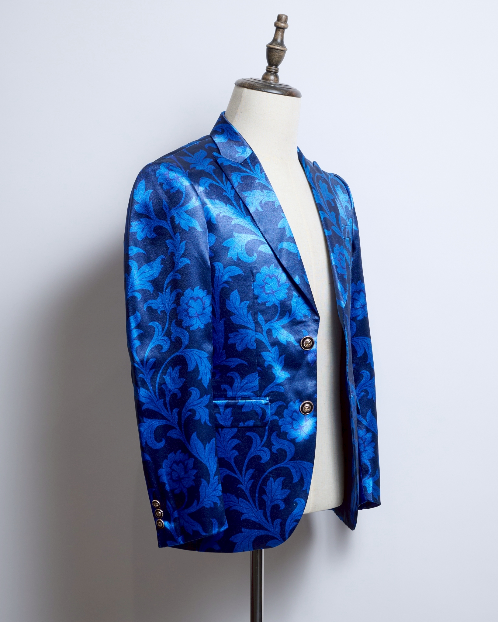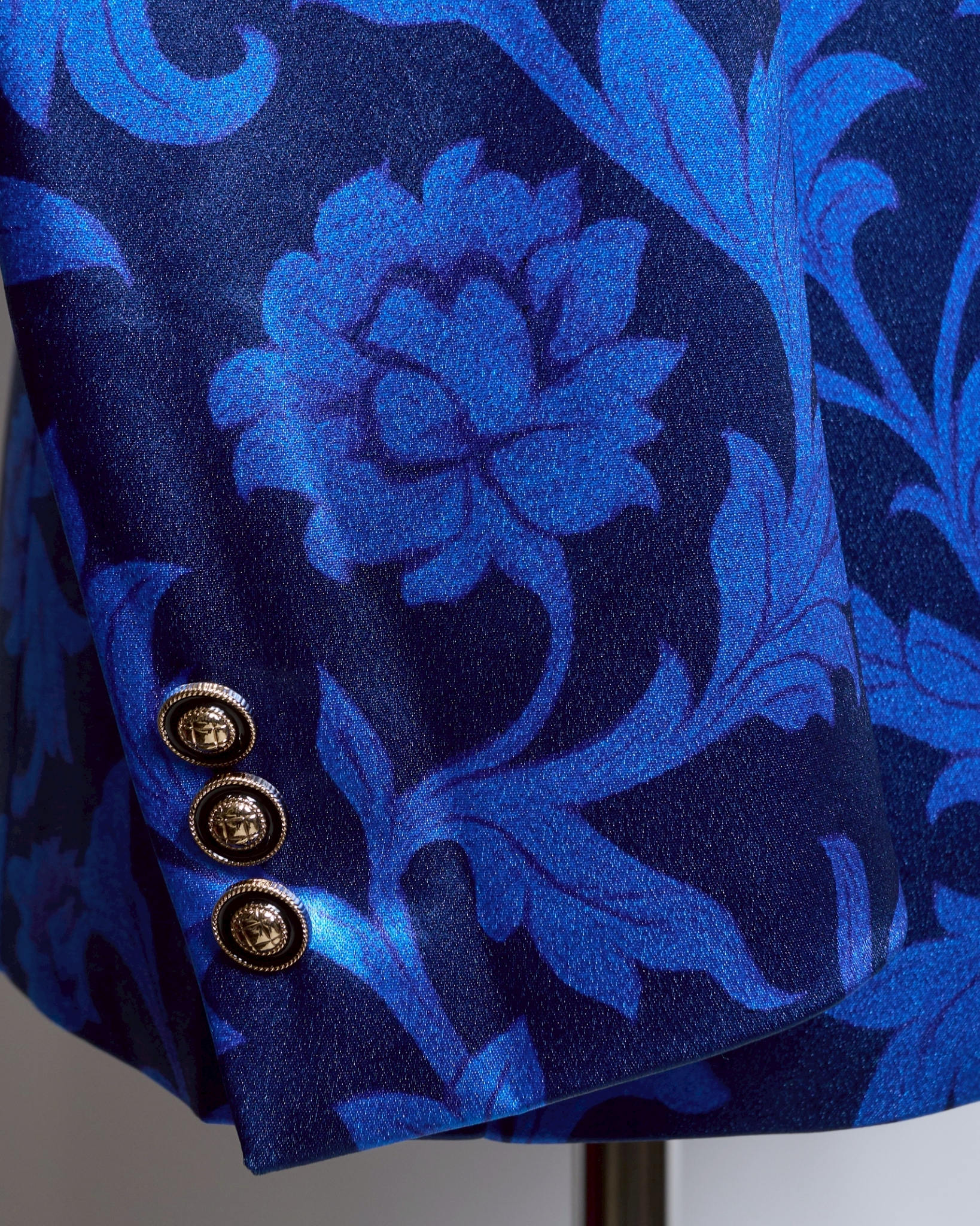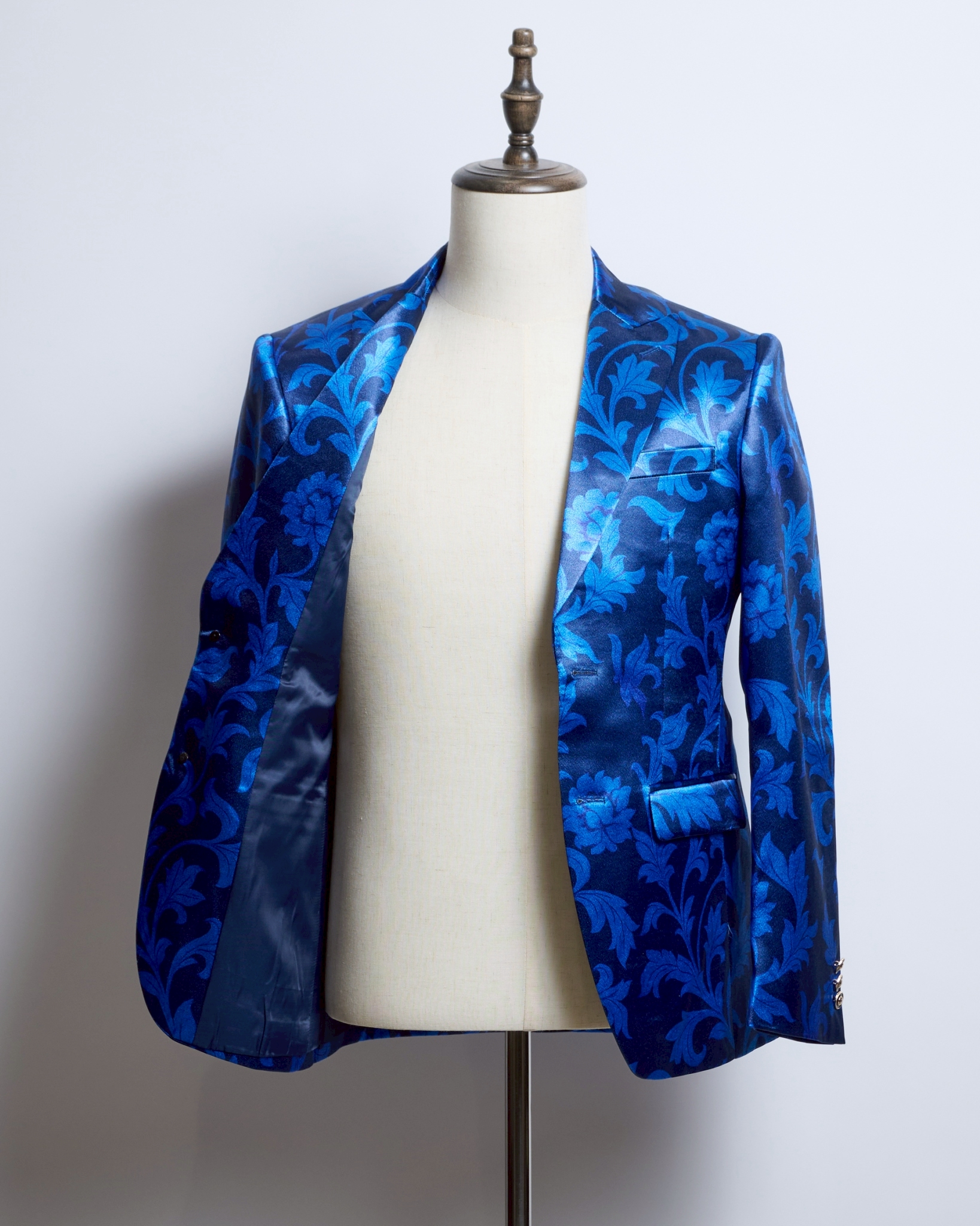 深みのあるネイビーベースに、鮮やかなブルーの花柄を織り込んだジャガード生地のシングルジャケット。