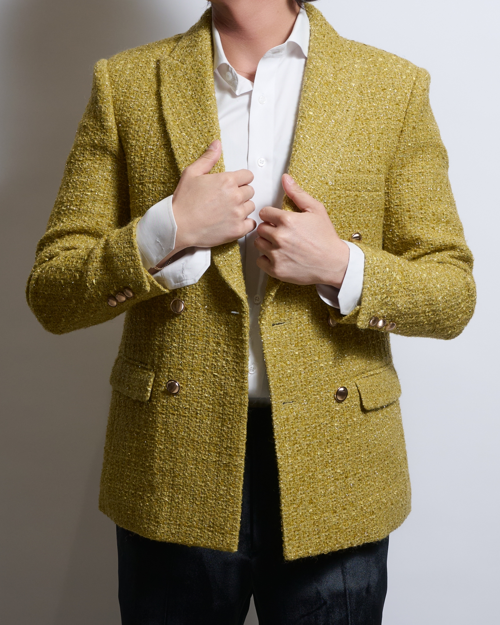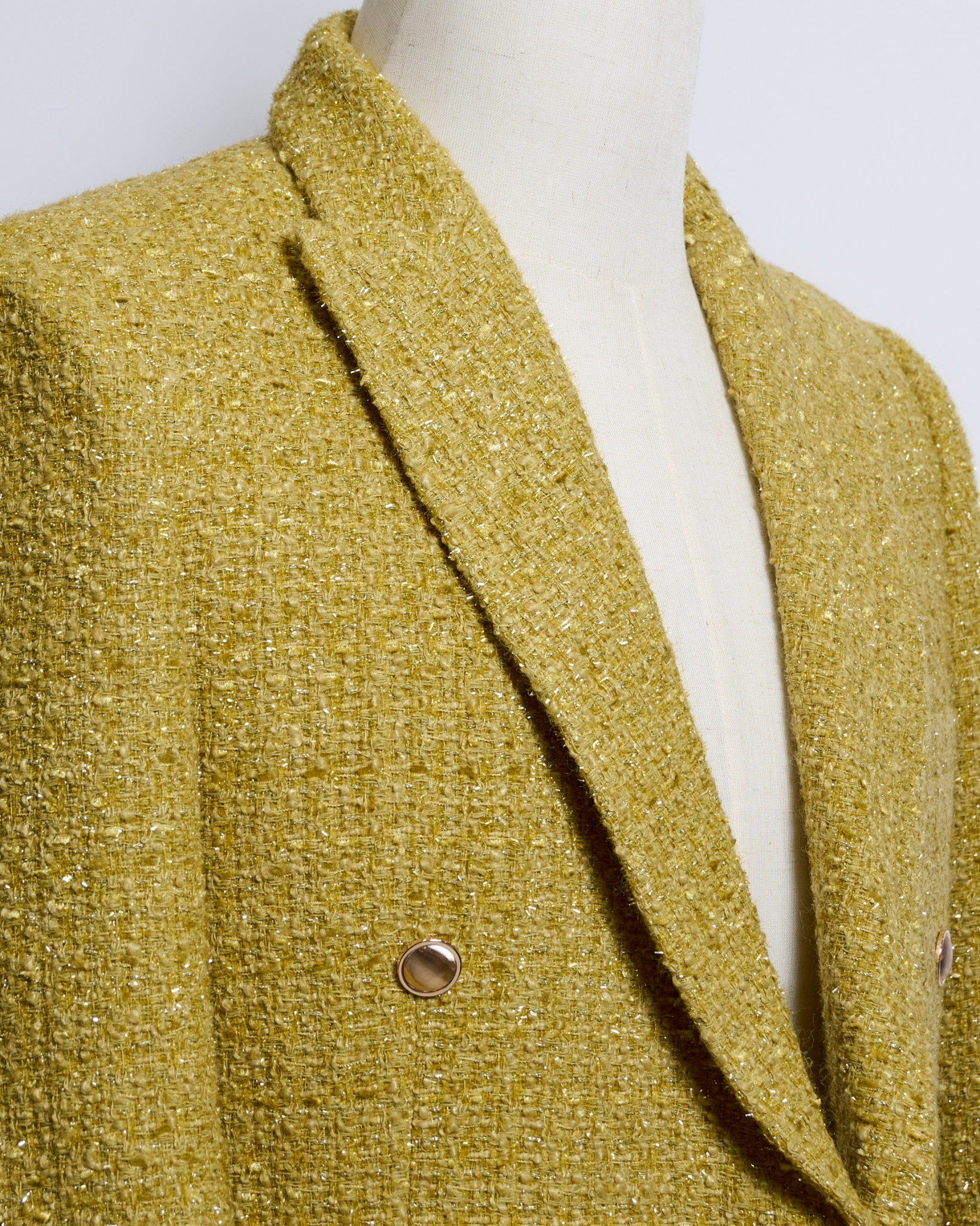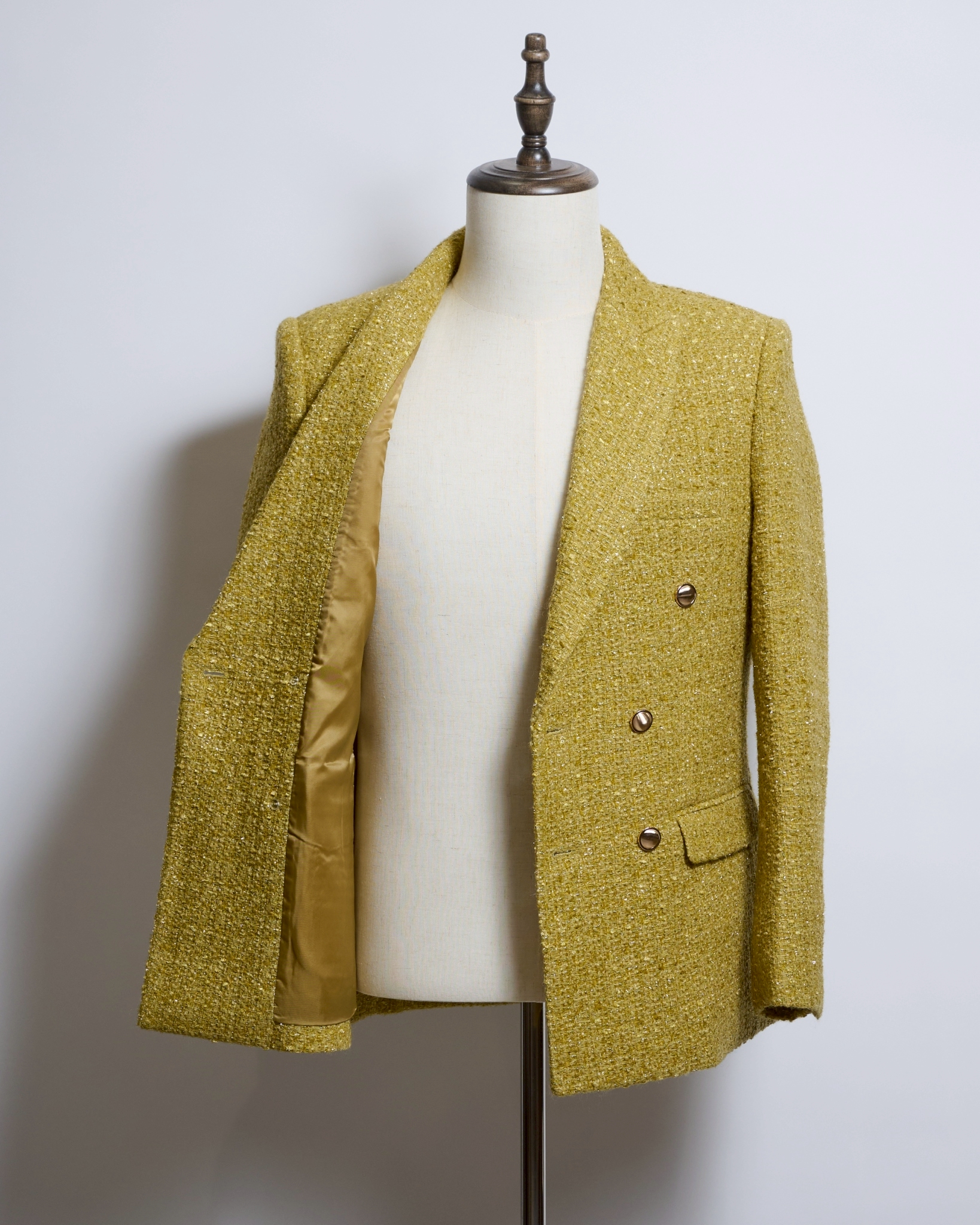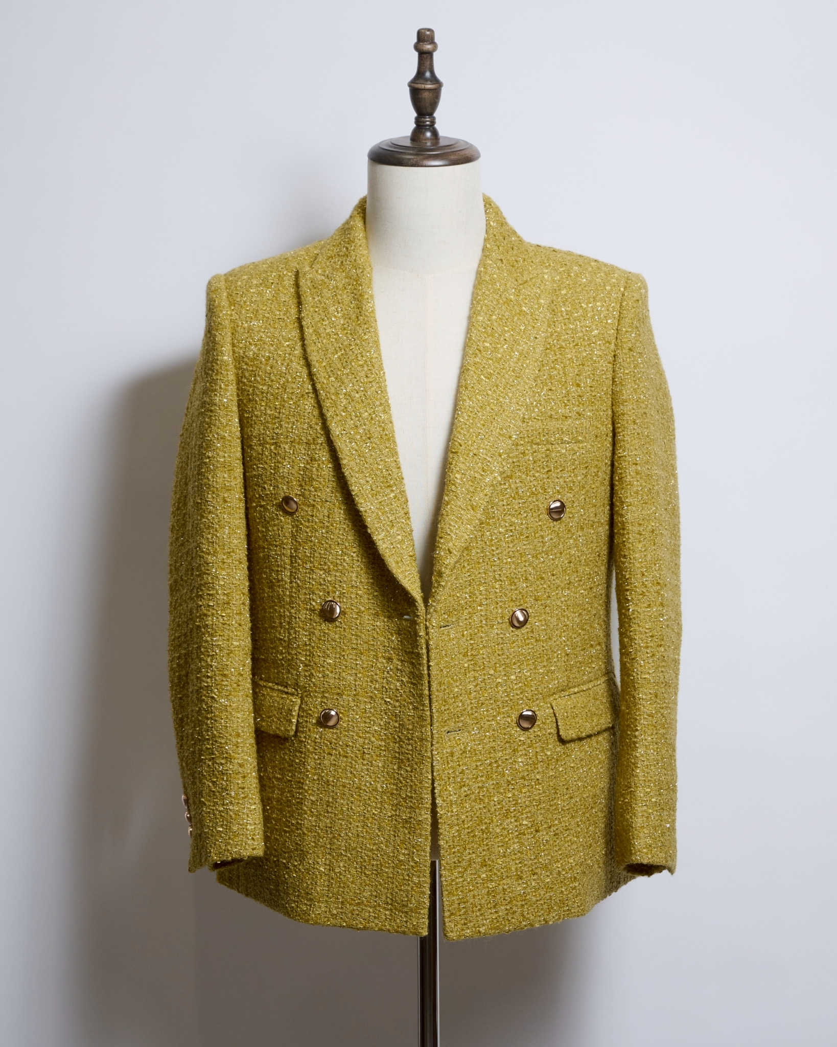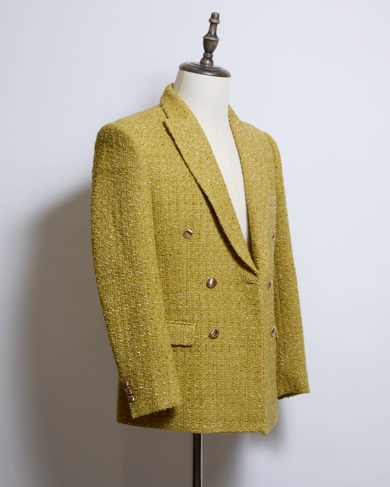 深みのあるマスタードイエローのブークレツイード生地を採用したダブルブレストジャケット。
