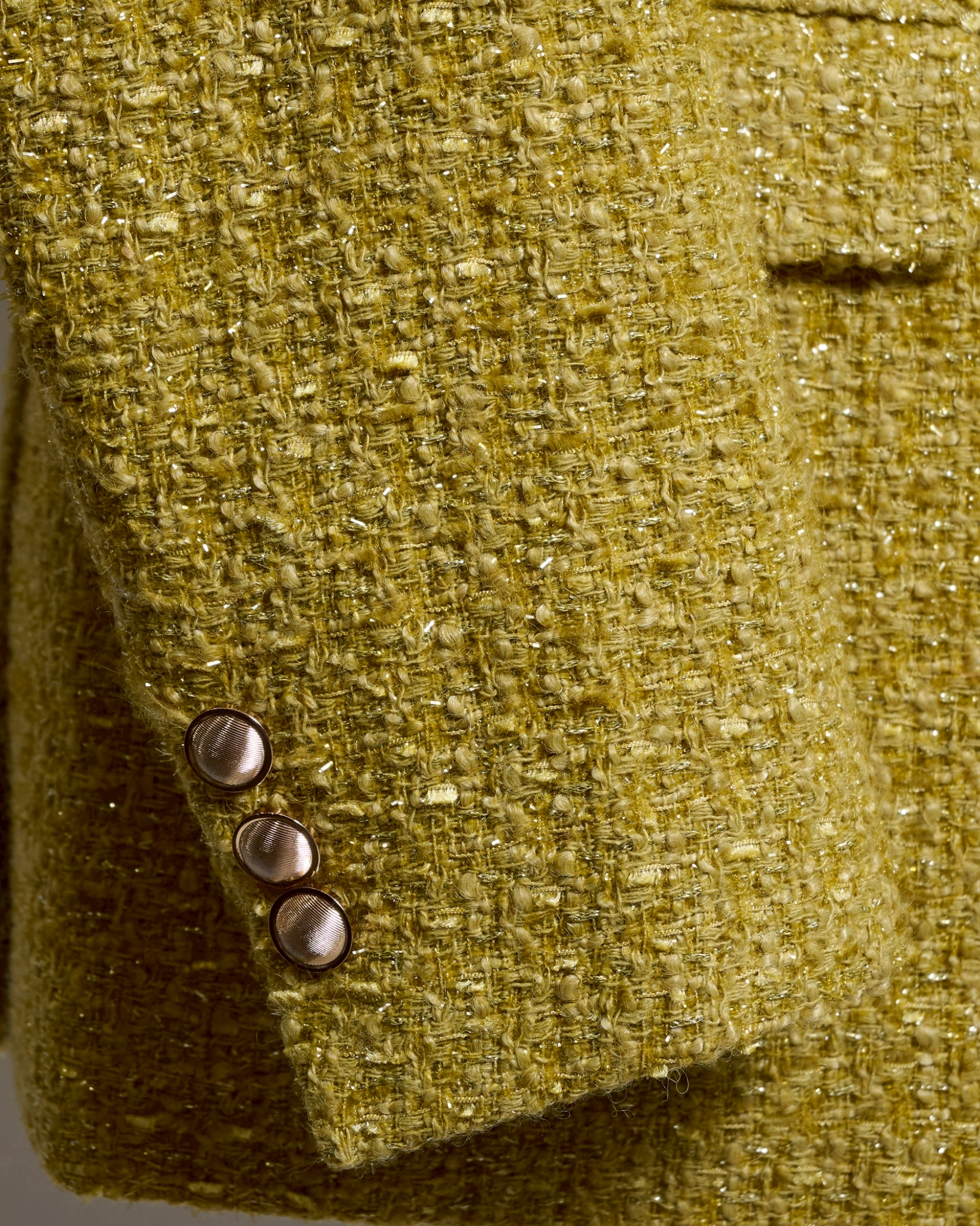 光の角度で繊細に輝くラメ糸を織り込み、ツイード特有の立体感と上品な艶を両立しています。