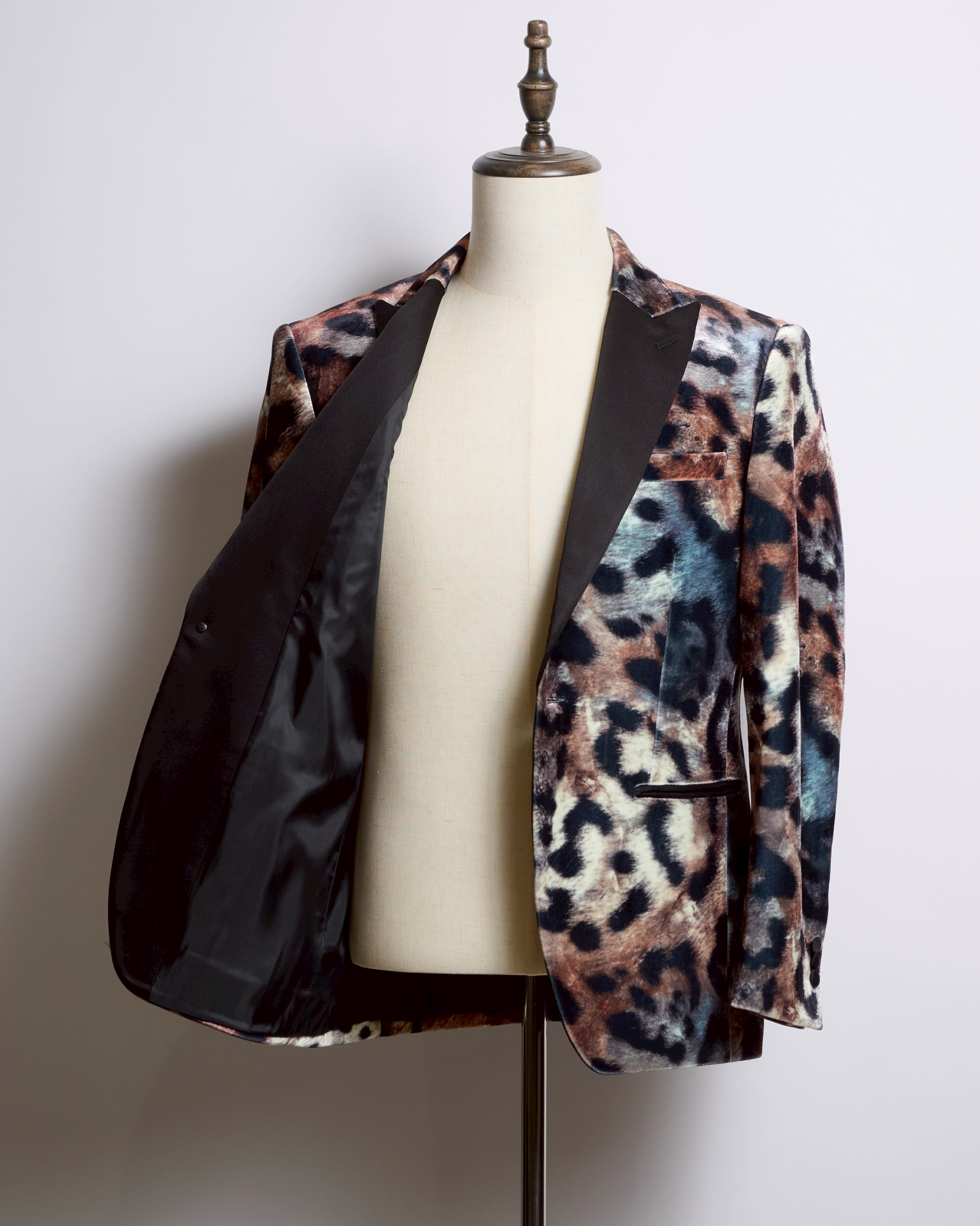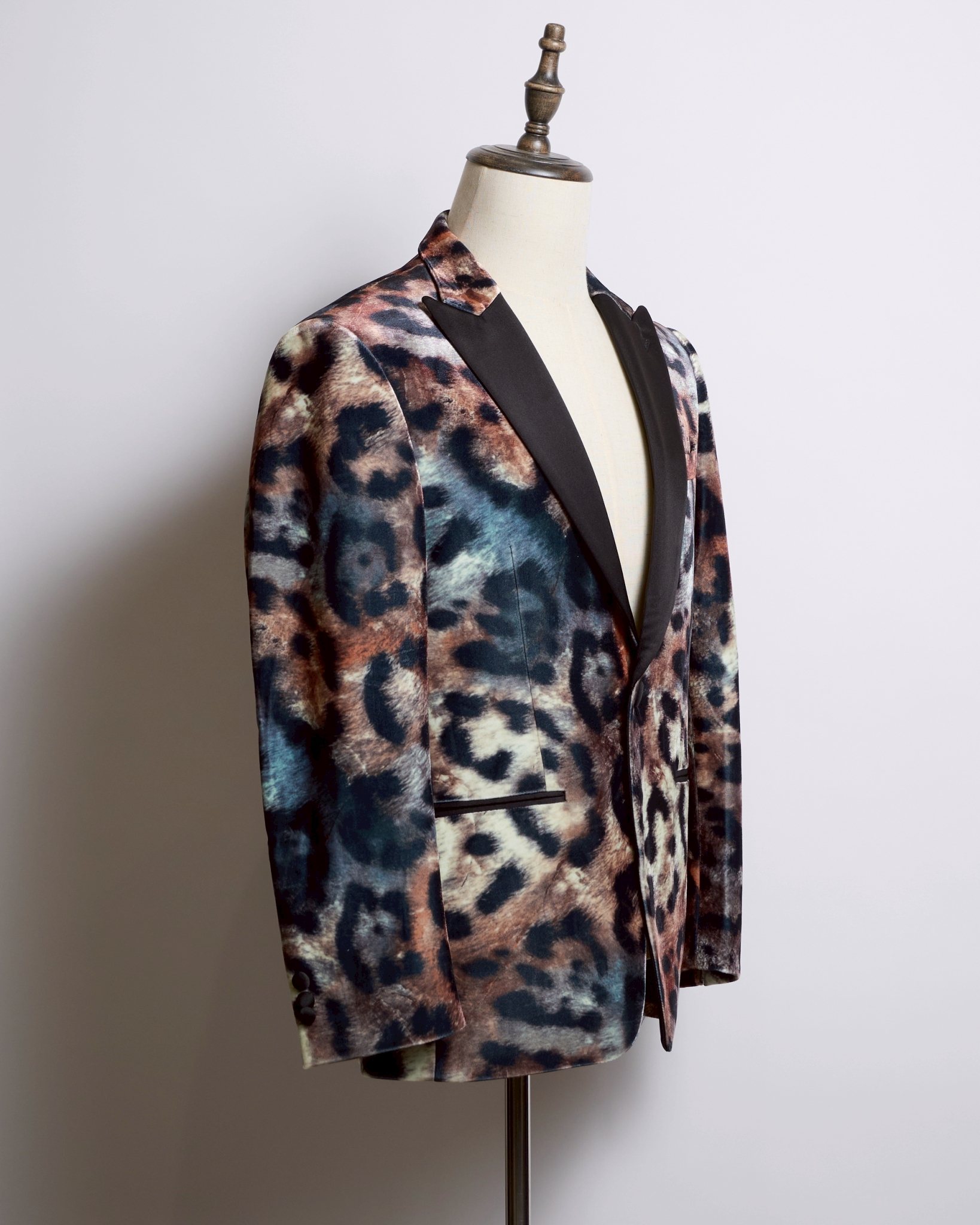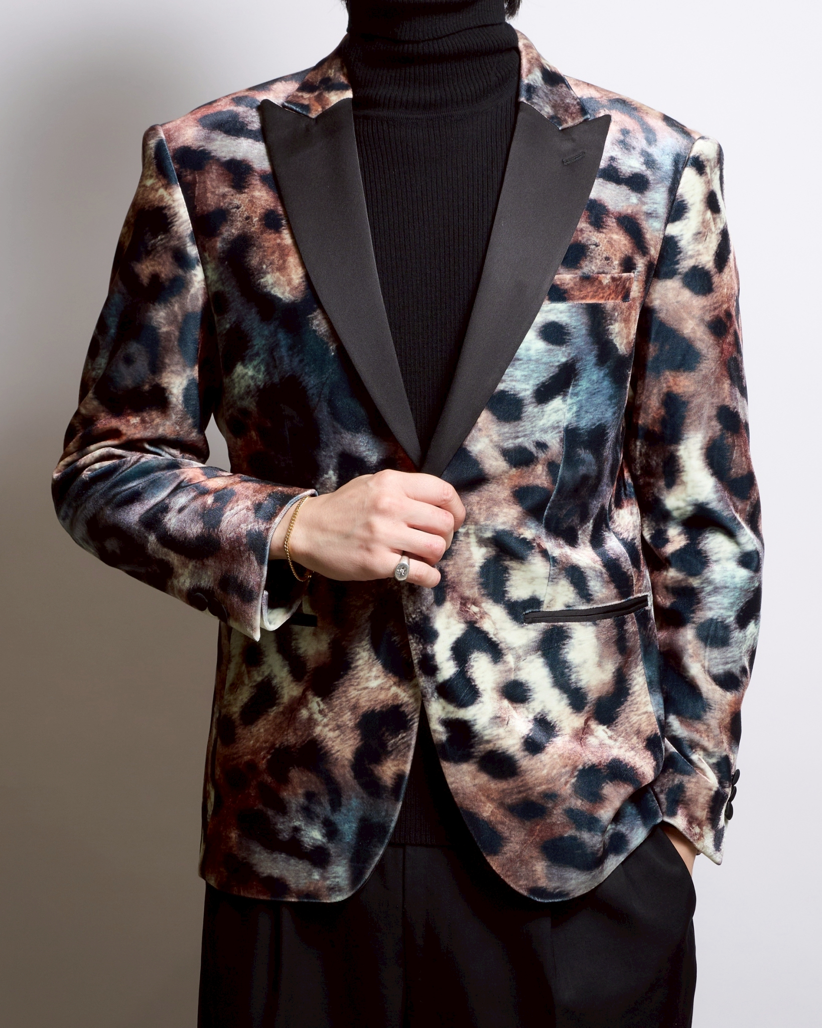 大胆なレオパード柄を、上質なベロアの光沢で上品にまとめた唯一無二の一着。