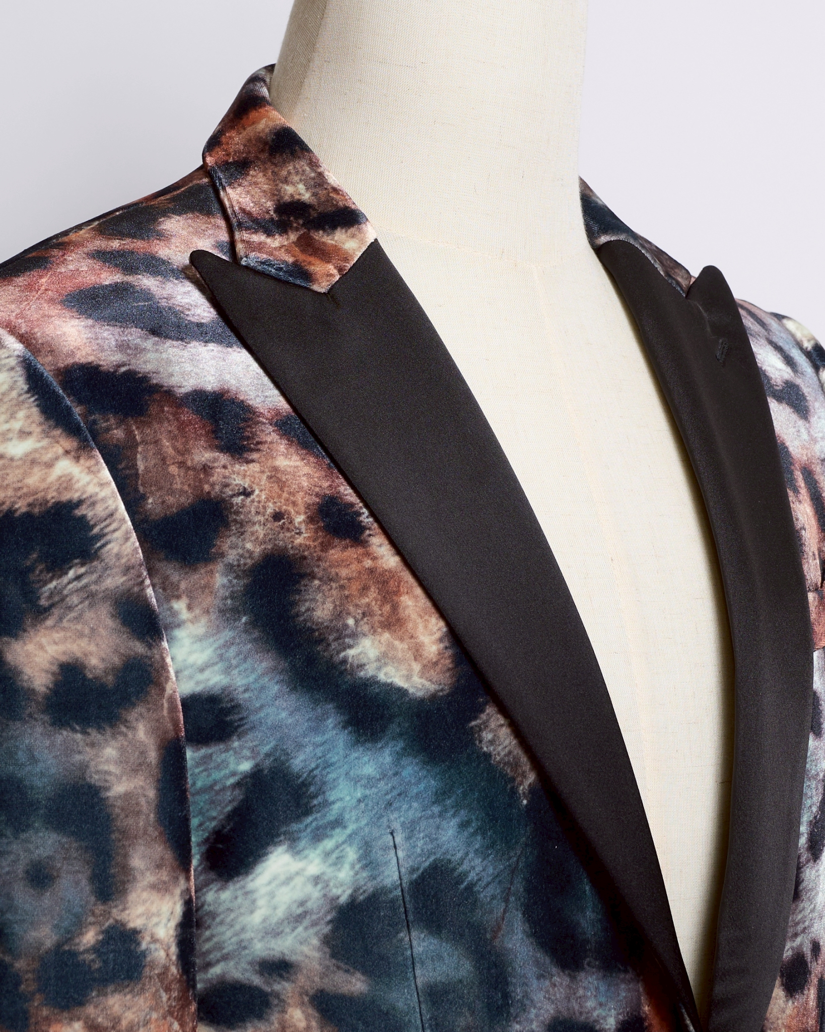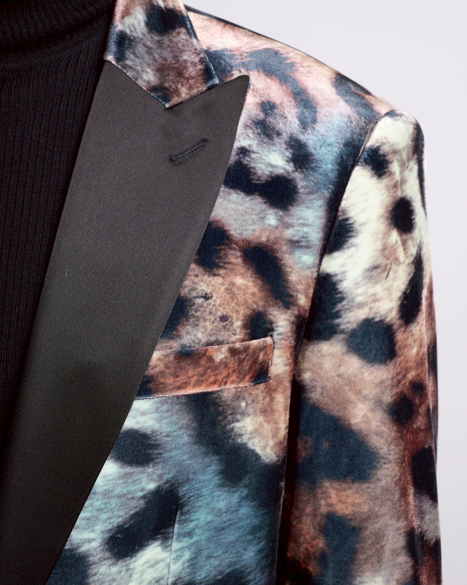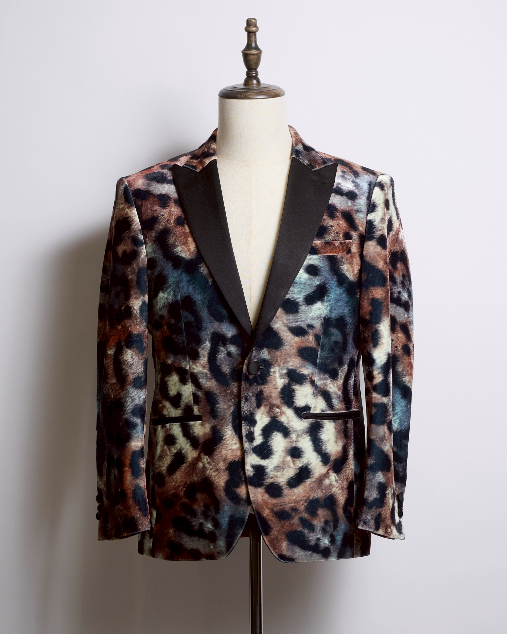 大胆なレオパード柄を、上質なベロアの光沢で上品にまとめた唯一無二の一着。
