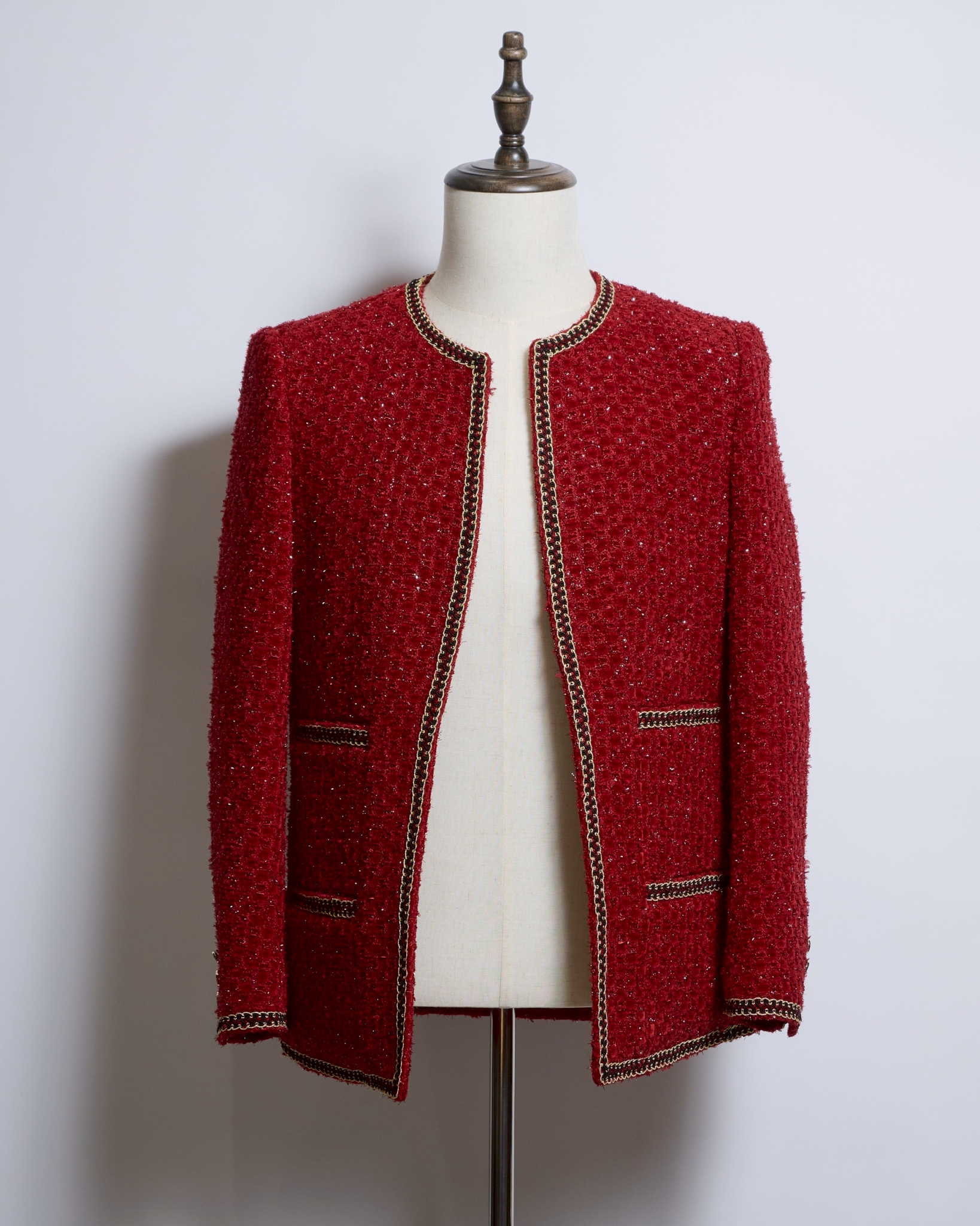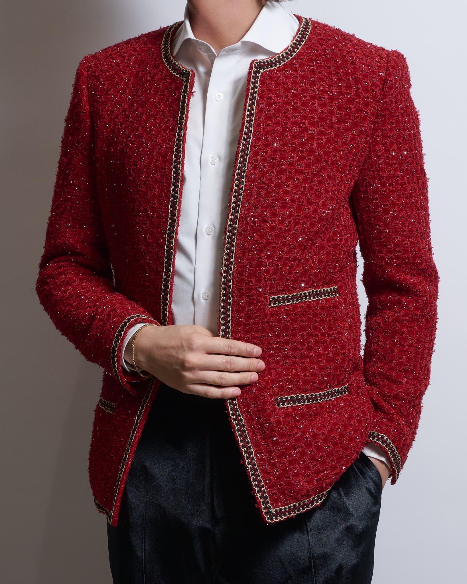 華やかなレッドのブークレツイード生地で仕立てたノーカラージャケット。